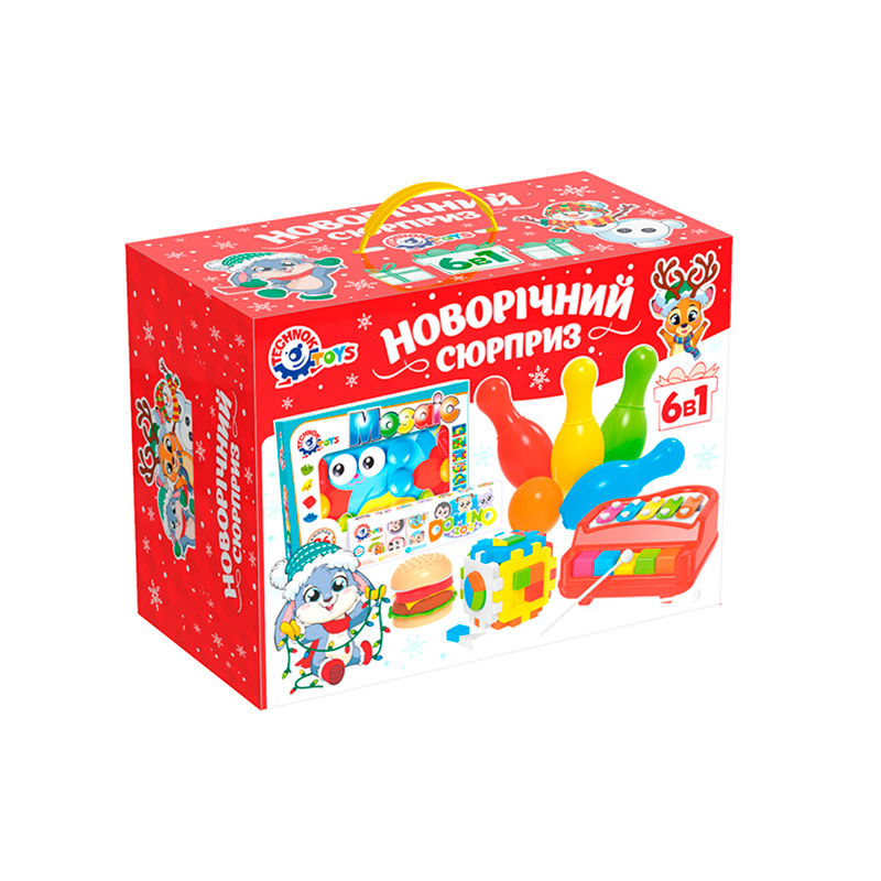 Велика святкова коробка, наповнена іграшками, — чудова ідея новорічного подарунка для хлопчиків та дівчаток. Тепер не потрібно думати, що обрати та який подарунок підійде найкраще. У подарунковому боксі вже є все необхідне для гри та розвитку.