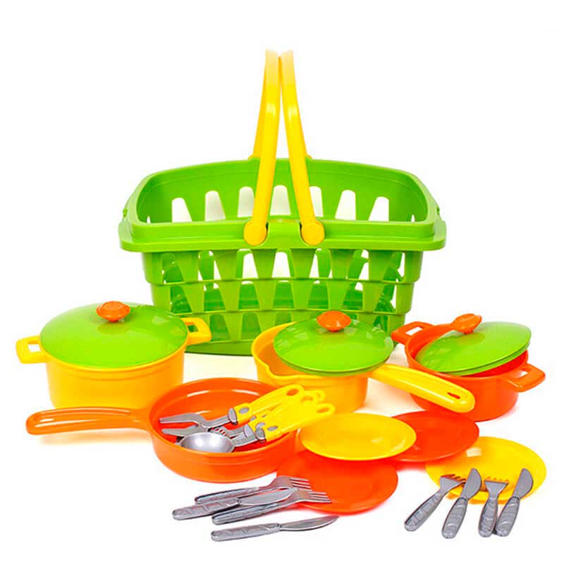 Кухонний набір у місткій корзині – справжня знахідка для маленької господині. Яскраві кольори та різноманіття посуду неодмінно привернуть увагу малечі та батьків.