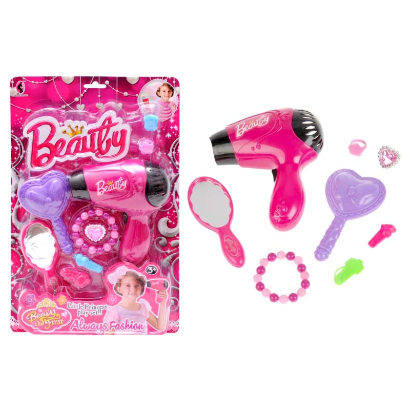 Ігровий набір з аксесуарами - найкращий подарунок для Вашої маленької принцеси. Комплектація: фен, дзеркальце, заколочки, гребінець.