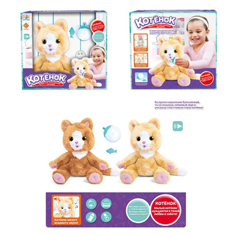 Інтерактивна тварина зі звуком Котик - граючи з плюшевою інтерактивною іграшкою, малюк весело проведе час і зможе розвинути мовлення, логічне мислення, координацію рухів і увагу. Це чарівне інтерактивне кошеня потребує того, щоб його погодували і подбали про нього. Коли кошеня їсть із пляшечки, то воно закриває очі та муркоче. Струсіть пляшечку для кумедного ефекту. Продовжуйте годувати його і воно засне. Якщо вийняти пляшечку з його рота - кошеня прокинеться, а очі відкриються. Товар представлений у 2 кольорах. Найкраща іграшка для Вашої дитини!
