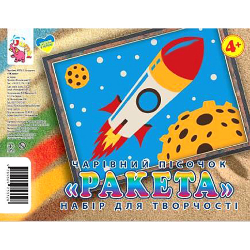До набору входять картонна картинка з клейкою основою, яка закрита захисною плівкою та кольоровий кварцовий пісок в окремих пакетиках.