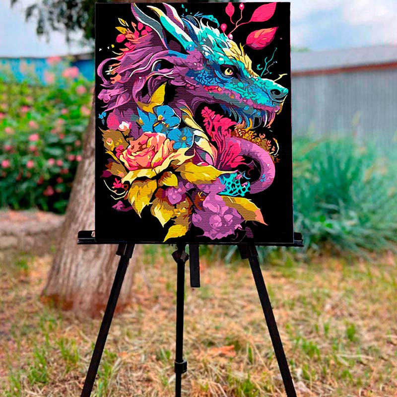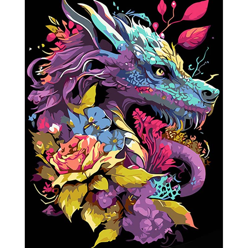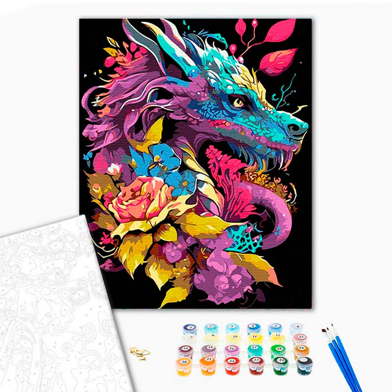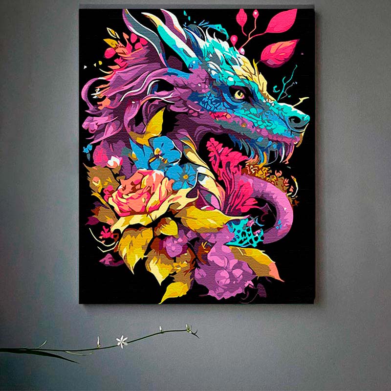 Картина за номерами Дракон у квітках Strateg на чорному фоні 40х50 см AH1037