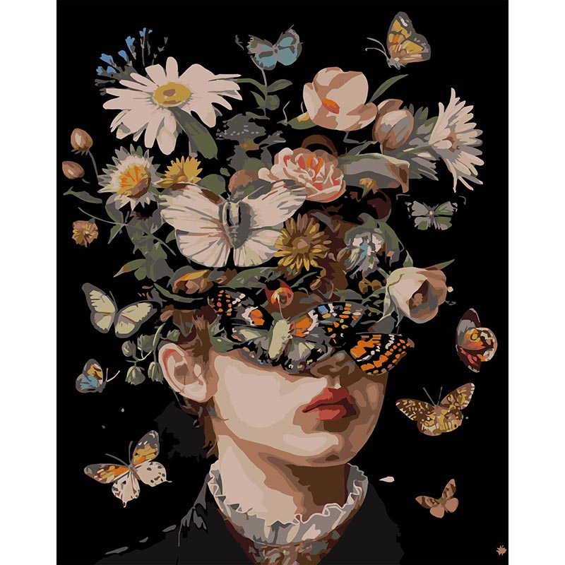 Картина за номерами Stateg Дівчина і метелики на чорному фоні 40х50 см AH1176-19
