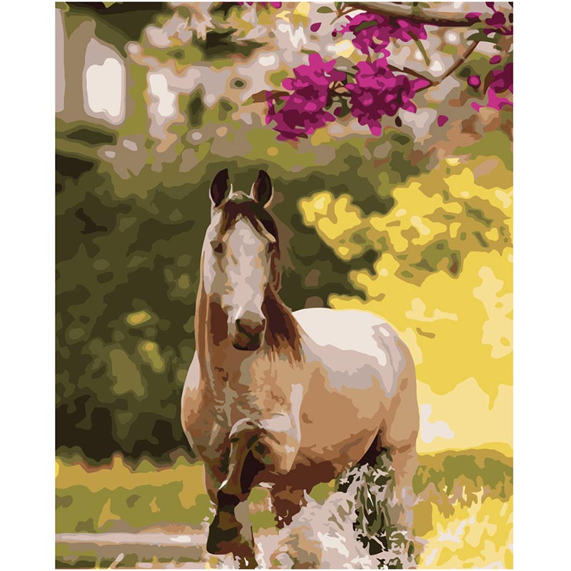 Картина за номерами Strateg ПРЕМІУМ Скакун біля квітів з лаком розміром 40х50 см SY6691
