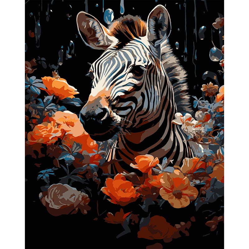 Картина за номерами Strateg ПРЕМІУМ Зебра у квітах на чорному фоні розміром 40х50 см (AH1231-17)