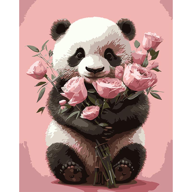 Картина за номерами Strateg Панда з букетом троянд на чорному фоні 40х50 см AH1221-17