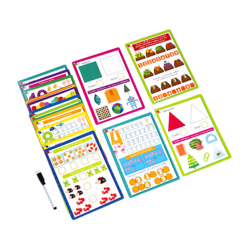 Комплектація: 20 двосторонніх карток, 70 завдань, маркер.