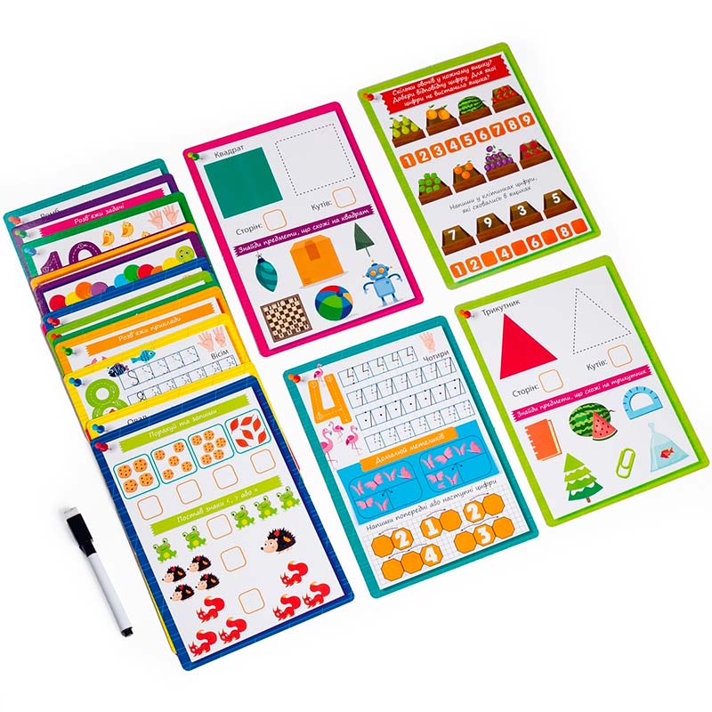Особливості: Завдяки багаторазовому маркеру можна знов і знов повертатись до написання цифр або виконання улюблених завдань, щоб закріпити пройдений матеріал.
