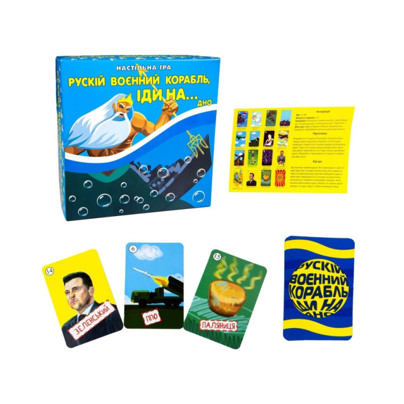 Герої цієї гри – Волонтери, Конотопські відьми, джавелін та інші українські атрибути боротьби 2022 року. Мета гри в тому, щоб перебити сумнозвісний вже на весь світ корабель та зібрати якомога більше карток. Роздайте гравцям по 12 карток, запам’ятайте їх та переверніть. Тепер по пам’ятті вам потрібно викладати більші за номіналом картки, ніж інші гравці. Якщо вам це вдалося, то забирайте всі викладені картки собі.