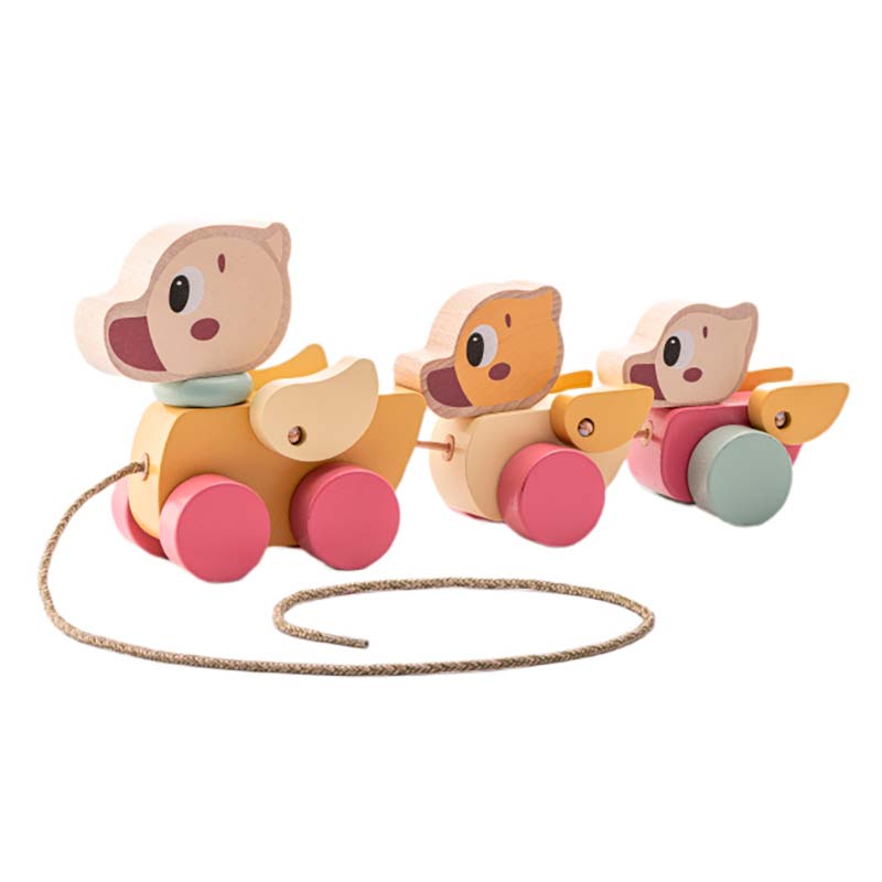 Весела каталка, що запрошує малюка в перші пригоди: ніжна композиція каченят у русі, яка пробуджує цікавість і бажання бігти за своєю іграшкою. Стриманий дизайн поєднує класичну дерев'яну естетику з яскравими деталями, що привертають увагу.