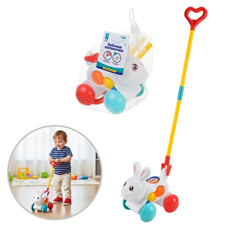 Рухома іграшка у формі зайця, оснащена ручкою для зручного переміщення під час гри. Конструкція передбачає просте штовхання та контроль руху завдяки виносній ручці; її наявність полегшує маніпуляції і додає зручності при використанні. Загальна висота вироба — 51.8 см, що дає уявлення про розміри та пропорції іграшки. Лаконічний зовнішній вигляд підкреслює ігровий характер виробу, а ергономічна форма ручки сприяє комфортному утриманню.