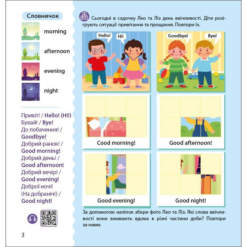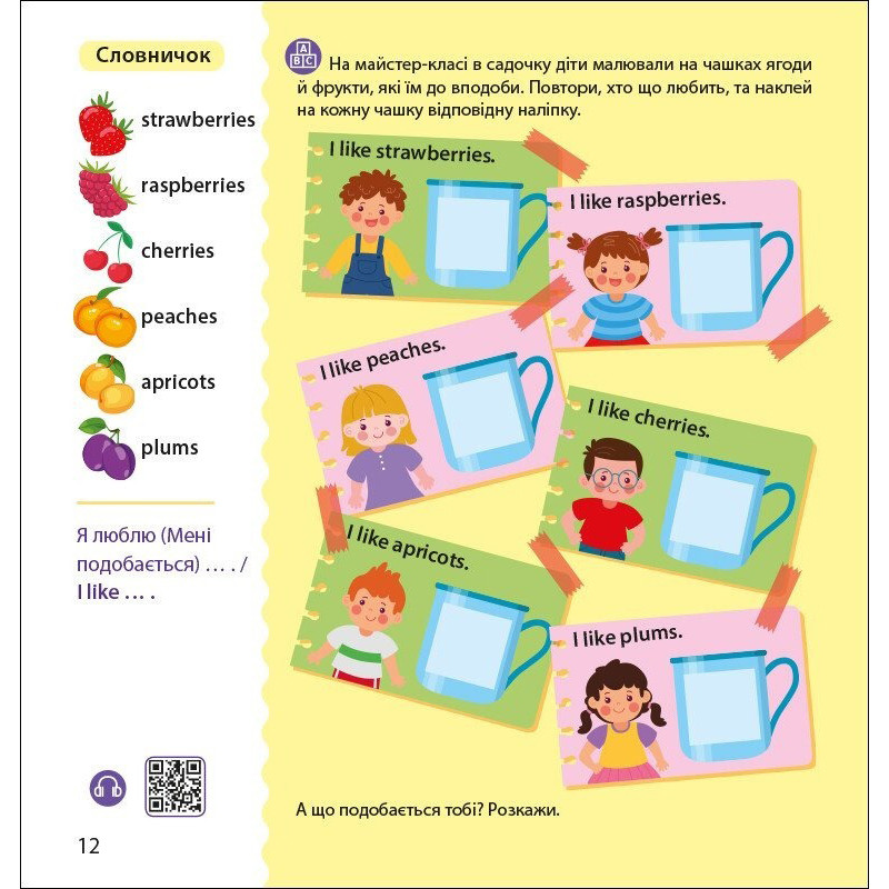 "Англійська з наліпками" — серія для першого знайомства з простою часто вживаною лексикою англійської мови з аудіосупроводом. У зошиті "Лео та Ліз запрошують до садочка", головні герої — веселі близнюки Лео та Ліз, кличуть дитину до свого садочка і навчають спілкуватися англійською. Різноманітні ігрові завдання, які тісно пов’язані з життям дітей, спонукають дошкільника до активного вживання англійської лексики. Книга містить також прості поради для батьків. Корисно для дітей 4-6 років.