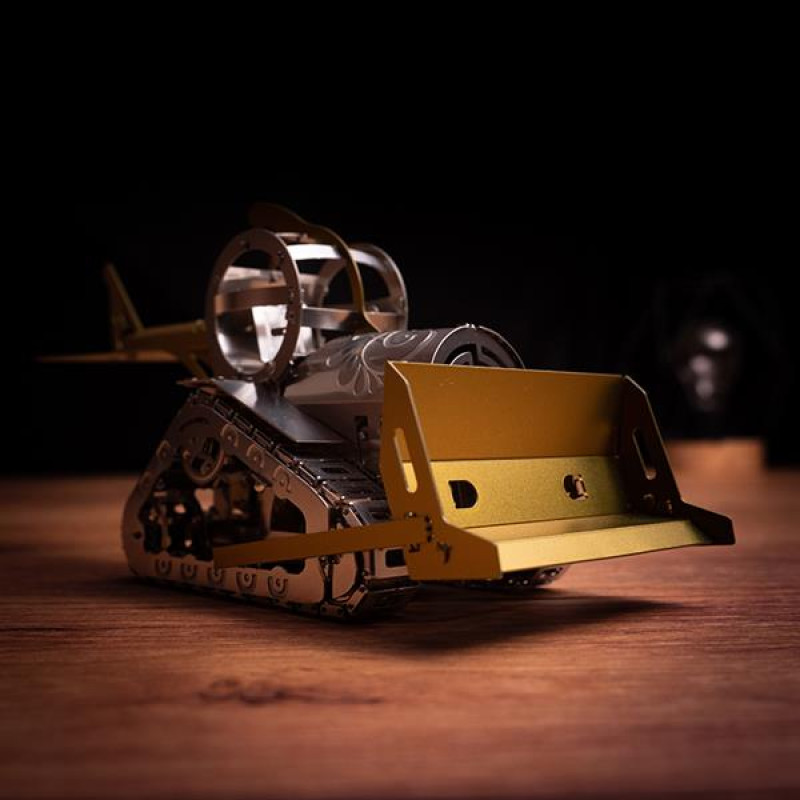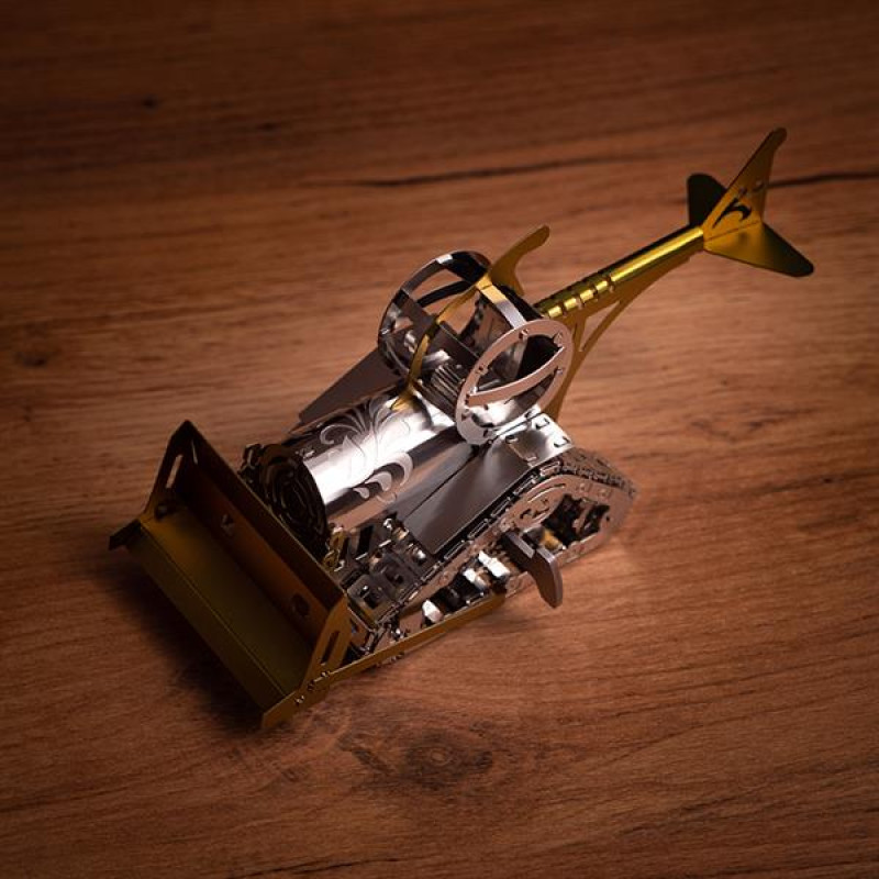 У всі часи конструктори запитували себе: 'А що, якщо?', коли винаходили нові види механізмів. І думали про те, що станеться, якщо поєднати риси одного механізму з іншим, замінити одну архітектурну деталь на іншу, із зовсім іншої машини. Іноді ці винаходи були продиктовані необхідністю, як, наприклад, дирижабль чи парова яхта, а іноді їх робили просто заради розваги.Кожен інженер потай мріє створити фантастичний пристрій, який був би втіленням усіх прогресивних ідей одночасно. На жаль, у світі реальної механіки це не завжди можливо. Але творці науково-фантастичних фільмів, відеоігор та масштабних моделей цілком можуть дозволити собі пофантазувати. А тепер подивіться і переконайтеся: незвичайна і унікальна модель для самостійного складання 'Graceful CAT'.Конструктори 'Metal Time', плануючи створення фантастичної моделі, вирішили поєднати кілька абсолютно різних механізмів. Платформа моделі 'Graceful CAT' - це бульдозер з характерними гусеницями. А на ній розмістили кабіну і хвіст гелікоптера та циліндричний 'локомотивний' моторний відсік. Загалом, вийшла весела іграшка, яка прикрасить будь-яку дитячу кімнату.DIY модель 'Graceful CAT' складається з платформи, типової для бульдозера, та частин інших механізмів. Платформа складається з пари трикутних гусеничних колісних систем. Гнучкі металеві гусениці мають зчеплення з колесами і передають рух всій моделі. Ще одна схожість з бульдозером - передній ківш.Моторний відсік виконаний у вигляді циліндричного капота, що надає моделі схожості з дитячим паровозиком. Його поверхня прикрашена орнаментом, що підкреслює декоративне призначення моделі. Несподіваною деталлю в 'Graceful CAT' є сферична кабіна з сидіннями та панеллю приладів всередині. Кабіну прикрашає кольорова деталь, яка переходить у хвостову частину гелікоптера.'Graceful CAT' виготовлений з використанням кольорової нержавіючої сталі, що робить його грайливим та кумедним.Модель оснащена пружинним механізмом заводу і пересувається по гусеницях на будь-якій горизонтальній поверхні та може долати невеликі перешкоди. 'Graceful CAT' - це незвичайний, яскравий дизайн, який покликаний покращувати настрій свого власника навіть від одного погляду на нього.Як і всі конструктори 'Metal Time', модель 'Graceful CAT' виготовлена з екологічно чистої нержавіючої сталі, яка використовується в харчовій промисловості, а також дозволена для виробництва товарів народного споживання та іграшок.Точний розкрій набору виключає можливість порізів під час складання. Деталі точно підігнані одна до одної і не створюватимуть проблем при з'єднанні. Приємні тактильні відчуття, міцність та естетичність шліфованого металу вигідно відрізняють сталеві деталі від дерев'яних або пластикових, що використовуються в інших наборах.Зручне плоске пакування з екологічного картону, що підлягає вторинній переробці, поєднує в собі компактність і естетику дорогого подарунка.Кожен покупець моделі 'Metal Time' отримує клубний значок, листівку з подякою та унікальний номер, який присвоюється кожній моделі. Вступ до клубу 'Metal Time' відкриває додаткові можливості для кожного покупця. Захоплюючий процес складання моделі призведе до дивовижного результату: ви отримаєте красиву, блискучу, філігранну модель на своєму робочому столі або на видному місці в інтер'єрі, як предмет гордості, або елемент колекції.Модель 'Graceful CAT' - ч