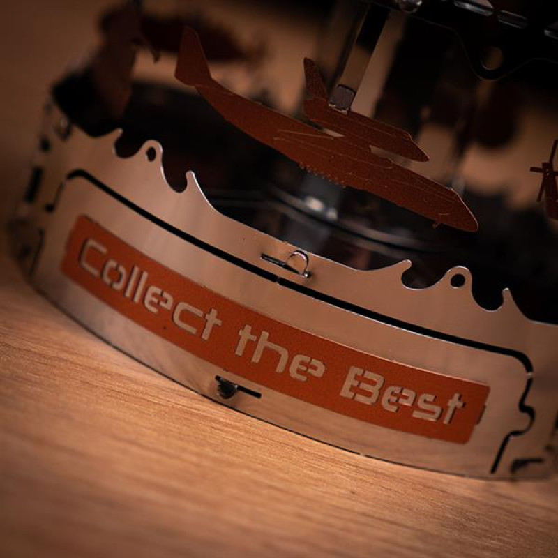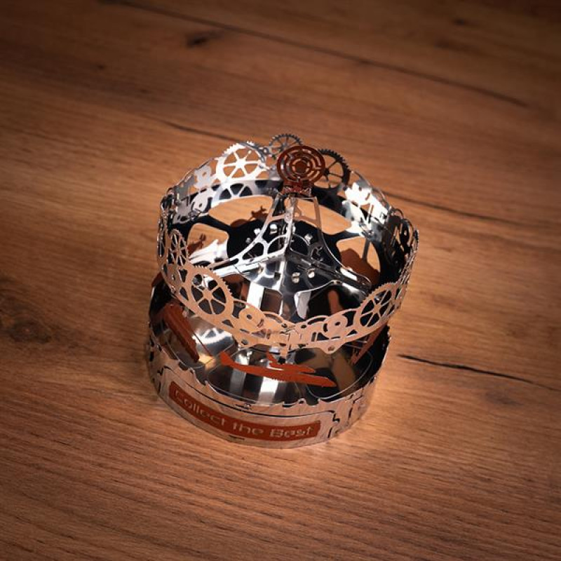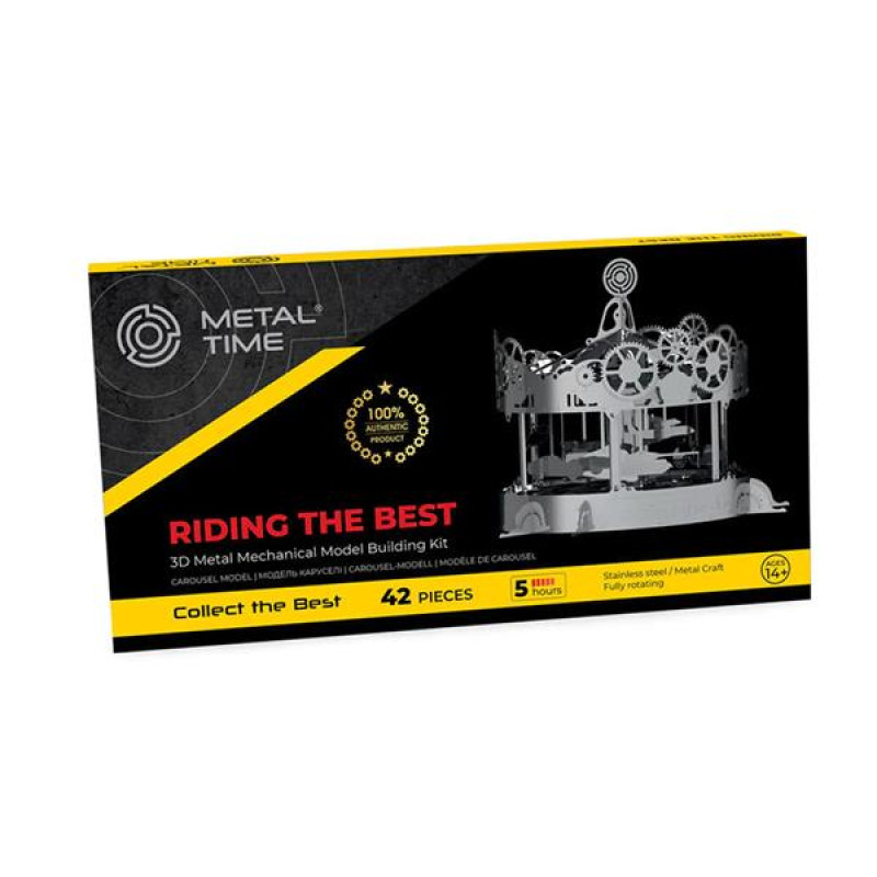 Дизайнери 'Metal Time' творчо підійшли до історичного образу і зберегли його основну архітектуру: обриси похідного намету, диск, що обертається, і фігури, розташовані по колу. У версії 'Riding the Best' моделі 'Metal Time' з'являються на каруселі. Таким чином, окрім годин технічної творчості та декорування інтер'єру, власники моделей отримують можливість вивчити та показати іншим наш модельний ряд.Модель для самостійного складання 'Riding the Best' складається з платформи, всередині якої знаходиться диск, що обертається за допомогою електродвигуна. На диску містяться схематичні зображення найпопулярніших моделей 'Metal Time'. Серед них можна впізнати ldquo;Elusive Nautilusrdquo;, ldquo;Ukrainian Dreamrdquo;, ldquo;Lifting Spiritrdquo;, ldquo;Roadway fantasyrdquo; та інші.Класичний навіс каруселі виконаний у вигляді орнаменту із зубчастих коліс. Вінчає його логотип 'Metal Time'.Поручні каруселі також прикрашені орнаментом і стилізованим слоганом компанії: 'Збирай найкраще!'.Модель 'Riding the Best' виготовлена з використанням кольорової нержавіючої сталі, що надає їй оригінального вигляду як яскравій частині модельного ряду. Це перетворює її на яскраву іграшку, частину інсталяції та елемент декору приміщення.Карусель рухається завдяки електродвигуну. Акумуляторний блок розташований в основі моделі. Всі контакти та провідники надійно ізольовані і не становлять загрози контакту зі шкірою користувача.Як і всі конструктори 'Metal Time', модель 'Riding the Best' виготовлена з екологічно чистої нержавіючої сталі, що використовується в харчовій промисловості та дозволена для виробництва товарів народного споживання та іграшок.Точний розкрій набору виключає можливість порізів під час складання. Деталі точно підігнані одна до одної і не створюватимуть проблем при з'єднаанні.Приємні тактильні відчуття, міцність та естетичність шліфованого металу вигідно відрізняють сталеві деталі від дерев'яних або пластикових, що використовуються в інших наборах конструкторів. Зручне плоске пакування з екологічного картону, що підлягає вторинній переробці, поєднує в собі компактність і естетику статусного подарунка.З кожною покупкою моделі 'Metal Time' ви отримуєте клубний значок, листівку з подякою та унікальний номер, який присвоюється кожній моделі. Приєднання до клубу 'Metal Time' відкриває додаткові можливості для кожного покупця.Модель 'Riding the Best' - чудовий подарунок для любителів технічної творчості, а також естетики складних металевих конструкцій. Кольорові деталі також перетворюють модель на чудову іграшку. Ця модель привнесе у ваш інтер'єр атмосферу свята в технічному стилі. Це може бути чудовим подарунком для юних дизайнерів та майбутніх інженерів.'Riding the Best' може стати прикрасою дитячої кімнати. А наявність моделі в діловому інтер'єрі підкреслить неординарність характеру власника і його готовність до несподіваних веселих вчинків.Збірна модель 'Riding the Best' призначена для широкого кола користувачів віком від 14 років.Вивчення та складання моделі розвиває навички технічної творчості та спонукає до вивчення історії науки і техніки. Це також чудове сімейне дозвілля. Збірка моделі 'Riding the Best' принесе вам багато веселих хвилин, але також змусить добре попрацювати руками. Адже вона складається з багатьох деталей, і зібрати її - гідне завдання для вас. Зате потім вся родина зможе пишатися спільним досягненням. Для клубів за інтересами та дружні