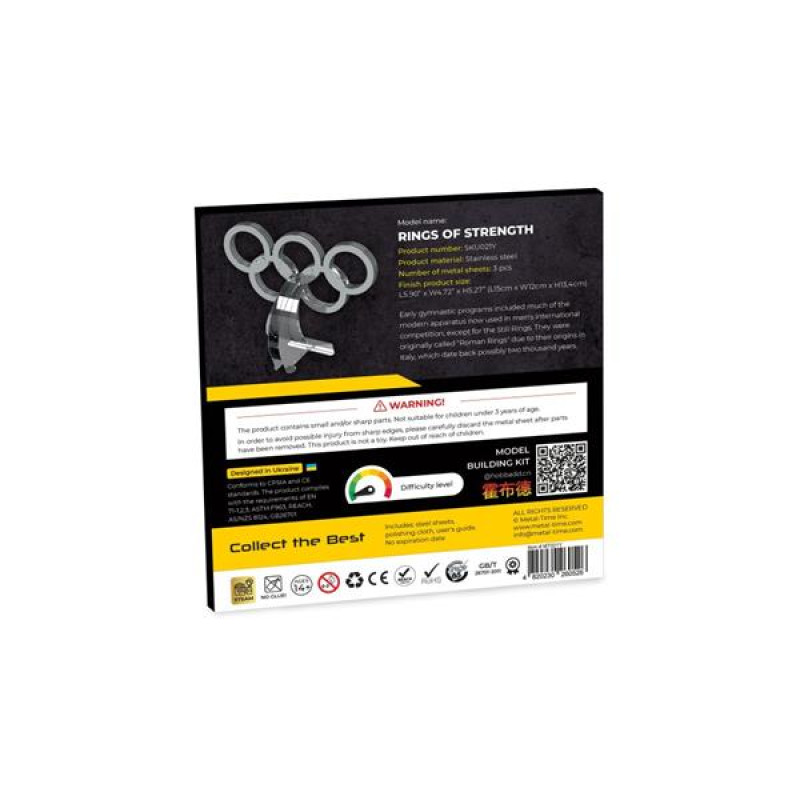 У рік проведення Токійської олімпіади дизайнери та інженери 'Metal Time' присвятили досягненням спортсменів модель 'Rings of Strength'.Ця нескладна конструкція вимагатиме зовсім небагато часу для складання, але в результаті стане чудовим декоративним доповненням інтер'єру для поціновувачів спорту та спортсменів.Якщо вам пощастило побувати на аренах олімпіади або ви тільки мрієте це зробити, Rings of Strength стануть свідченням ваших устремлінь і оригінальним пам'ятним сувеніром.Модель Rings of Strength складається з п'яти кілець, об'єднаних в одну композицію, закріплену на витончено зігнутій підставці.Ця конструкція передбачає використання моделі як прикраси інтер'єру.Вона може займати центральне місце серед призів та медалей спортсмена як знак його олімпійських амбіцій або на столі вболівальника, який підтримує своїх улюблених спортсменів.Металевий блиск та витончений дизайн привабить також любителів гарних речей у домі, і, звичайно ж, колекціонерів збірних моделей.Як і всі збірні моделі 'Metal Time', модель 'Rings of Strength' створена з екологічної нержавіючої сталі, яка використовується в харчовій промисловості та допущена для виробництва товарів народного споживання та іграшок.Точний розкрій набору виключає можливість порізів у процесі збирання. Деталі точно підігнані одна до одної та та не створять проблем зі з'єднанням.Приємні тактильні відчуття, міцність та естетика матового металу вигідно відрізняють сталеві деталі від дерев'яних або пластикових, які застосовуються в інших конструкторах.Зручна плоска упаковка з екологічно чистого картону, придатного для вторинної переробки, поєднує компактність та естетику статусного подарунка.