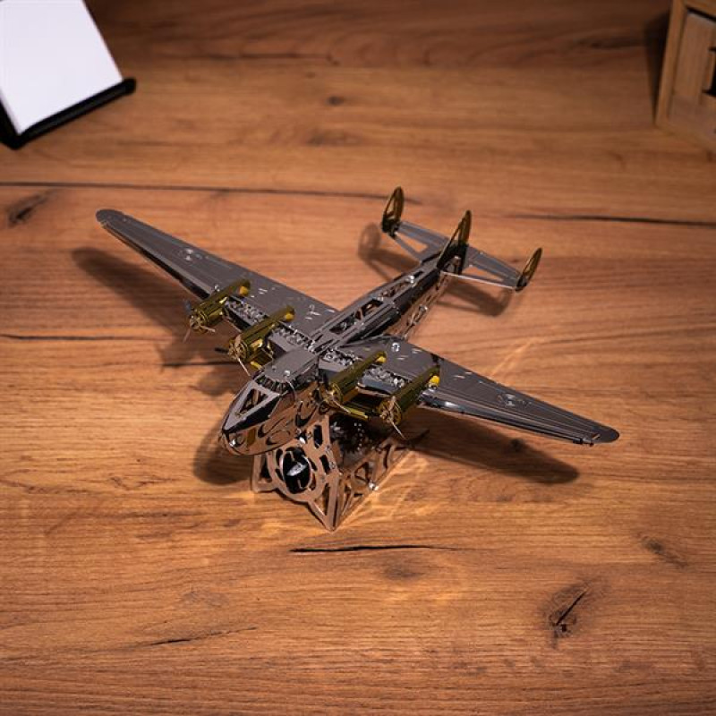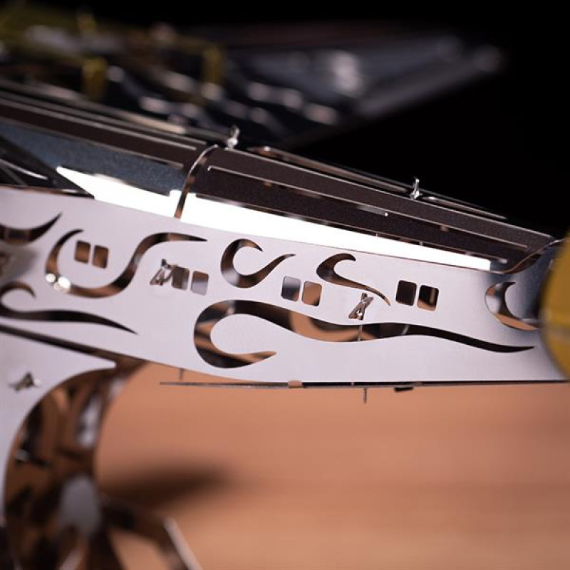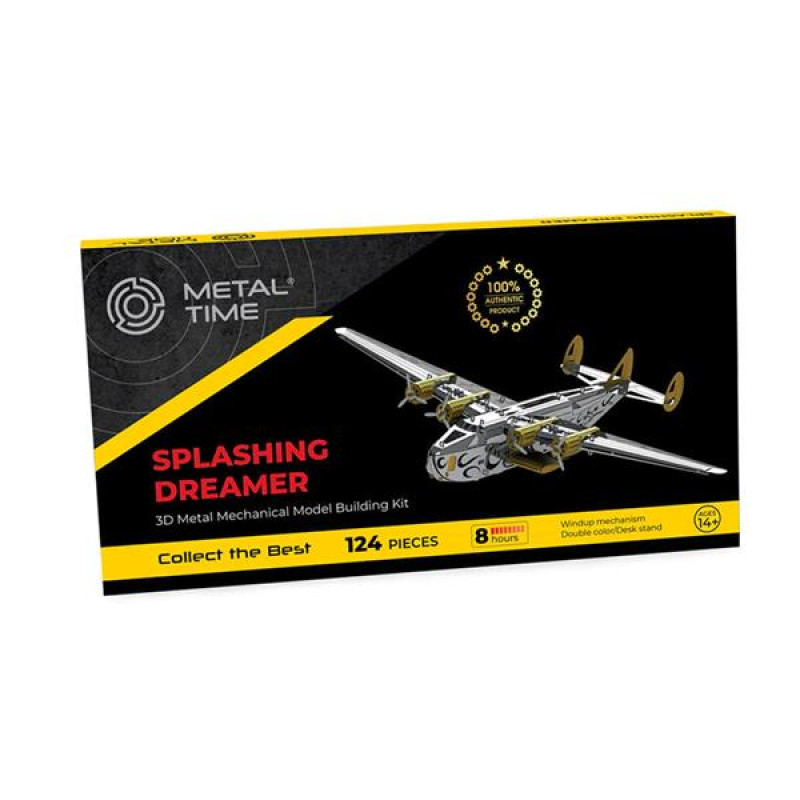 ІСТОРІЯ ПРОТОТИПУПерельоти через Атлантику були подвигом для пілотів і пасажирів, хоча в першій половині 20-го століття вони відбувалися досить часто і регулярно. Подорож часто тривала більшу частину дня, техніка не викликала довіри, а погодні умови створювали щохвилинний стрес. І раптом з'явився літак, здатний забезпечити пасажирам безпрецедентний комфорт і безпеку. Навіть у разі непередбачуваної посадки над океаном він гарантував виживання всіх, хто перебував на борту. Секрет у тому, що це був літак-поплавок Boeing 314 Yankee Clipper.Він був схожий на один з поверхів розкішного готелю. Висувні стільці, ресторанний порцеляновий посуд і столове срібло, першокласний сервіс. Це був такий літак, де Джеймс Бонд міг замовити свій улюблений коктейль, не встаючи, і випити його з кришталевого келиха. Конструкція гідролітака і запаси ресурсів дозволяли йому перебувати в повітрі до доби без дозаправлення, а в разі несправностей - сідати на воду і продовжувати свій шлях, як величезний човен.Друга світова війна змінила функціональність цих літаків, і розкіш повітряних подорожей залишилася в минулому. Віддаючи данину поваги цьому творінню американських інженерів, команда Metal Time створила набір для самостійного складання 'Splashing Dreamer' на основі конструкції цього славного гідролітака.Кожна модель літака має свою легенду. Чому дизайнери обрали саме цю конструкцію, щоб створити її з нержавіючої сталі, додати рухомі деталі, пружину та розставити акценти за допомогою кольорових компонентів? 'Splashing Dreamer' - це історія знаменитого гідролітака. Цей літак, окрім своєї розкоші, був видатним інженерним рішенням свого часу, а багато його технічних особливостей використовуються в сучасних літаках. 'Splashing Dreamer' - це чотиримоторний монолітний гідролітак з характерною геометрією хвостового оперення.Щоб підкреслити статус цього літального апарату, команда Metal Time використала в дизайні моделі кольорові деталі з нержавіючої сталі. Накладки на корпусах двигунів, поплавках-спонсонах і хвостових стабілізаторах виконані в мідно-золотому кольорі. Цим же кольором позначені двері кабіни літака.ОСОБЛИВОСТІ, ПЕРЕВАГИКорпус гідролітака розташований на стійкій підставці, яка також містить заводний механізм з пружиною і ключем. За допомогою шестерень рух від нього передається на гвинти двигунів. Однак модель можна легко відокремити від підставки, наприклад, для гри або використання як частини макета чи інсталяції. Від'єднані від центрального механізму, гвинти можна рухати лише обертаючи їх вручну.Можна влаштовувати 'повітряні бої' з моделями, тримаючи їх у руках. Можна зібрати макет аеродрому. Можна навіть зімітувати 'посадку' гідролітака на воду, однак потрібно розуміти, що 'Splashing Dreamer' не втримається на поверхні води, оскільки модель має багато технологічних і декоративних отворів. Проте, занурення у воду не загрожує моделі та її механізмам, адже вони виготовлені з нержавіючої сталі.Корпус гідролітака прикрашають орнаменти, що імітують хвилі та потоки води та повітря, вирізані з металу. Крім естетичної функції, це полегшує модель.Як і всі конструктори Metal Time, модель 'Splashing Dreamer' виготовлена з екологічно чистої нержавіючої сталі, що використовується в харчовій промисловості та дозволена для виробництва товарів народного споживання та іграшок.Зібрати 'Splashing Dreamer' - непросте з