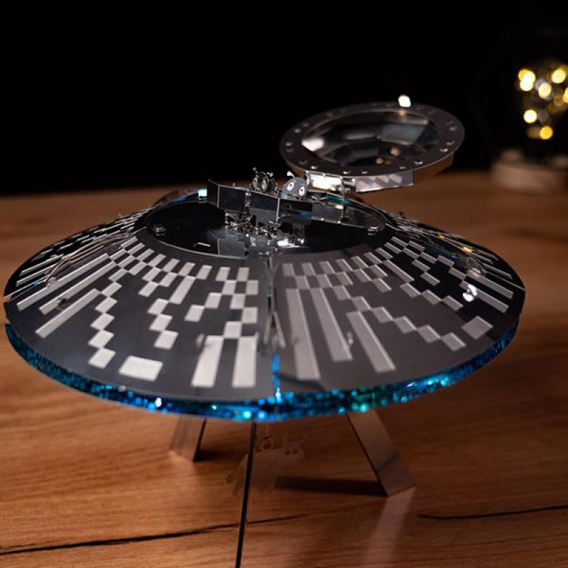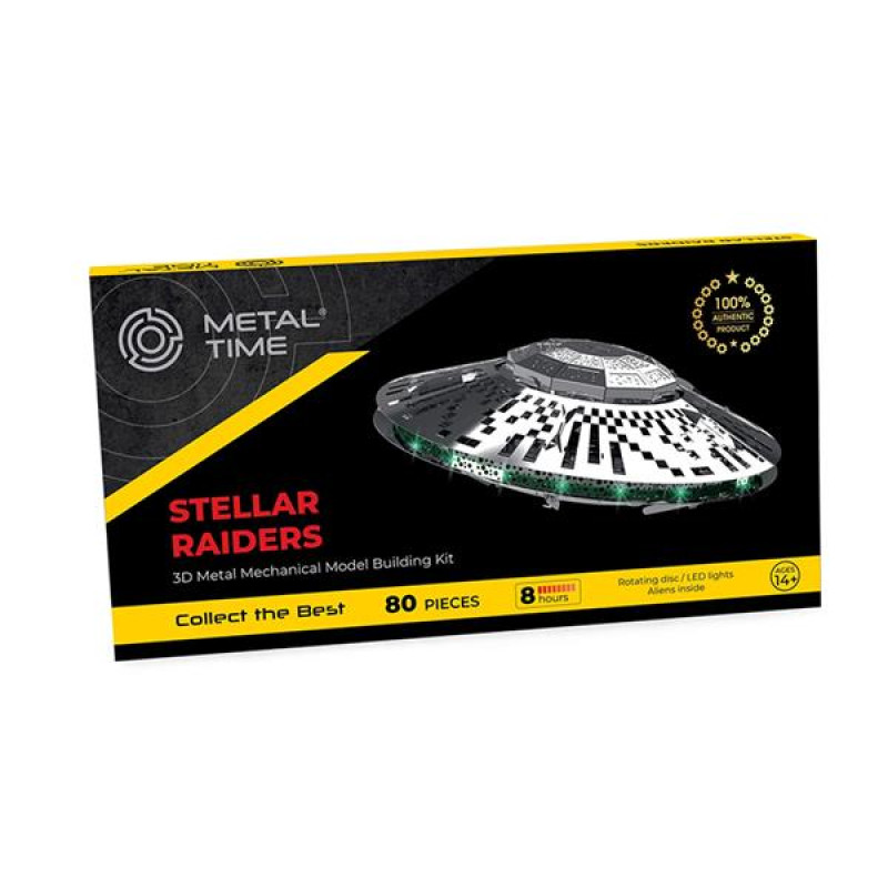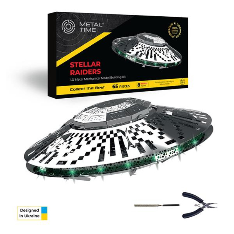 ІСТОРІЯ ПРОТОТИПУУ далекому 1948 році поблизу американського містечка Розуелл на Землю впав об'єкт, який досі вважається кораблем прибульців. Однак ні тоді, ні в усі наступні роки ніхто не бачив подібних апаратів зблизька. Однак образ 'літаючої тарілки', запущений в маси журналістами, став впізнаваним мемом, що перетворився на явище масової культури.'Metal Time' створює моделі будь-яких пристроїв, що піддаються інженерному аналізу та конструкторському втіленню, і не може залишатися осторонь об'єктів, які розбурхують людську свідомість. Тому в новій моделі для набору 'Збери сам' 'Stellar Raiders' були зібрані всі впізнавані риси кораблів прибульців з космосу.Тепер вам не потрібно їхати в Розвелл на пошуки 'літаючої тарілки'. Вона приземлиться прямо біля вашого будинку!За основу інженери 'Metal Time' взяли форму 'літаючої тарілки', а також численні легенди про те, що інопланетяни викрадають людей і тварин. Щоб досягти потрібного рівня натхнення для створення моделі 'Stellar Raiders', всій команді довелося перечитати гору фантастичної літератури, переглянути безліч коміксів і 10 сезонів серіалу 'Секретні матеріали'.Завдяки цьому результат вийшов чудовим, і він сподобається як прихильникам ідеї неминучого інопланетного вторгнення, так і скептикам. Тому що модель 'Stellar Raiders' надзвичайно гарна. Дизайнери використали безліч художніх елементів, кольорову нержавіючу сталь, складні методи травлення, висічки, світлові ефекти та складні механізми.Усе це ставить перед власниками конструктора дуже складне завдання, адже для того, щоб зібрати цю модель, їм доведеться застосувати свої навички, набуті під час роботи з нашими попередніми конструкторами.З іншого боку, поповнення колекції моделей Metal Time готовою до польоту моделлю НЛО стане довгоочікуваною нагородою для шанувальників металевих DIY-моделей і прикрасить будь-який трофейний магазин.ОСОБЛИВОСТІ ТА ПЕРЕВАГИЯк і всі конструктори 'Metal Time', модель 'Stellar Raiders' виготовлена з нержавіючої сталі, харчової та дозволеної для використання у виробництві товарів широкого вжитку та іграшок.Щоб надати моделі унікального вигляду, деякі деталі пофарбовані в різні кольори: 'обідок' тарілки - зелений, а купол - синій. Вони також прикрашені стилізованою 'інопланетною' символікою. На куполі рельєфними крапками зображені знаки, що нагадують архітектуру QR-кодів, а на обідку - візерунок з вирізаних отворів.'Промені', що виходять з центру корабля, стали основою для стенду в стилі модерн. Між 'променями' знаходиться корова, яку інопланетяни викрадають для експериментів (або заради молока, як у популярному телесеріалі). Завдяки вбудованому механізму тварину можна як втягнути в тарілку, так і опустити на землю.Усередині моделі інопланетного корабля знаходяться його 'пілоти' - класично зображені прибульці.Уся конструкція тарілки обертається навколо своєї осі. Ефект прибуття доповнюється світловими ефектами від джерела світла, розташованого всередині конструкції. Завдяки численним отворам у тілі моделі, вона створює відблиски на стінах і стелі приміщення, що робить її не лише декоративним елементом, а й оригінальним джерелом освітлення.Для 'Metal Time' 'Stellar Raiders' - одна з перших у лінійці 2022 року, і вона демонструє нові тренди наборів конструкторів на новий рік.Кольоровий метал, світлові ефекти та безліч рухомих деталей стають новим напрямко