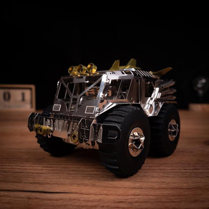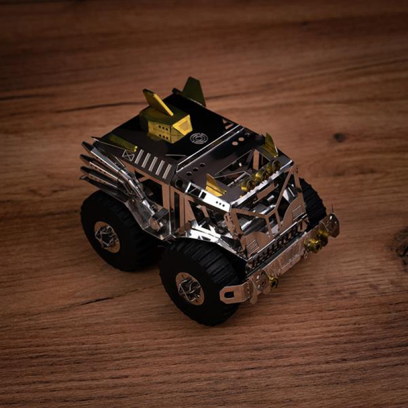 За основу саморобної моделі 'Trophy Hunter' конструктори 'Metal Time' взяли український всюдихід 'Шерп' з колесами наднизького тиску. Такі машини вже давно працюють у віддалених куточках планети. Але творці не втрималися від спокуси надати моделі футуристичних рис, завдяки чому вона стала схожою на персонажа науково-фантастичного фільму про підкорення інших планет. Любителям космічної тематики сподобається.Модель 'Trophy Hunter' - це концепт всюдихода для дослідження інших світів. Завдяки великим безкамерним колесам з гумовими шинами модель може долати перешкоди до 1/3 своєї висоти. Модель оснащена інерційним механізмом з маховиком, який дозволяє моделі самостійно рухатися після розгону. Це відкриває можливості для моделістів змагатися у дальності та швидкості своїх моделей.'Trophy Hunter' оздоблений кольоровими футуристичними елементами, орнаментами та декоративними деталями. Шість вихлопних труб надають моделі вигляду потужного пристрою, готового до подолання перешкод.Велику увагу дизайнери приділили деталям всередині моделі. Сидіння і приладова панель в кабіні добре проглядаються крізь вікна. Вікна в багажному відділенні дозволяють побачити маховик і шестерні механізму, а також їх роботу під час руху.Багато деталей і складний механізм змусять власників набору 'Trophy Hunter' використовувати свої механічні таланти на повну.Як і всі конструктори 'Metal Time', модель 'Trophy Hunter' виготовлена з екологічно чистої нержавіючої сталі, що використовується в харчовій промисловості та дозволена для виробництва товарів народного споживання та іграшок.Точний розкрій набору виключає можливість порізів під час складання. Деталі точно підігнані одна до одної і не створюватимуть проблем при з'єднанні.Приємні тактильні відчуття, міцність та естетичність шліфованого металу вигідно відрізняють сталеві деталі від дерев'яних або пластикових, що використовуються в інших наборах конструкторів.Зручне плоске пакування з екологічного картону, що підлягає вторинній переробці, поєднує в собі компактність і естетику статусного подарунка.З кожною покупкою моделі 'Metal Time' ви отримуєте клубний значок, листівку з подякою та унікальний номер, який присвоюється кожній моделі. Вступ до клубу 'Metal Time' відкриває додаткові можливості для кожного покупця.Модель 'Trophy Hunter' - це подарунок для справжніх любителів пригод, подорожей, фантазії та потужних автомобілів. Після складання ця модель займе гідне місце в гаражі кожного моделіста.Можливості моделі дозволяють застосовувати її в різних видах діяльності. Ви можете змусити 'Trophy Hunter' змагатися з аналогічними моделями за швидкістю, дальністю пробігу на одній і тій же установці, подоланням перешкод. Причому в різноманітності перешкод обмеженням може бути лише ваша фантазія.Крім активної функції, модель 'Trophy Hunter' може виконувати і суто декоративну. Вона займе гідне місце на стенді колекції моделей, а також стане оригінальною прикрасою інтер'єру для автолюбителя, стола для фаната відеоігор, робочого стола для автоконструктора або письменника науково-фантастичних романів.Вивчення та складання моделі розвиває навички технічної творчості та спонукає до вивчення історії науки і техніки. Крім навчання, збірка моделі послужить зміцненню сімейного та офісного колективу, а також дозволить весело провести час в дружній компанії. Збірка мо