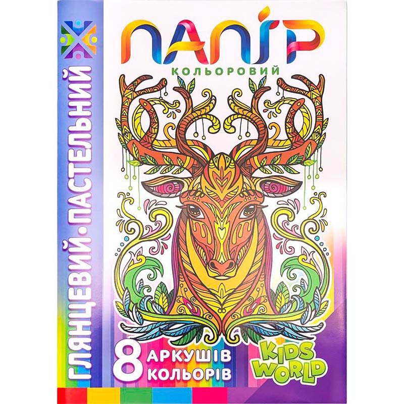 Набор цветной бумаги пастель, глянцевой, односторонней на скобе , 8 листов, цвета :желтый, розовый, красный, фиолетовый голубой, зеленый, коричневый, черный, формат А4 210*297мм