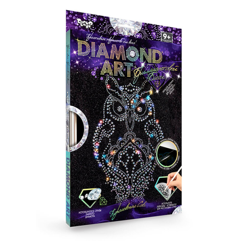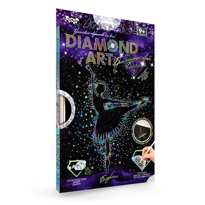 Набір для креативної творчості "DIAMOND ART" оснащений нноваційною технологією "Липка поверхня". Використовуйте олівець-аплікатор для розстановки страз різного діаметру, а потім, прикрашайте картину глітером для більшого блиску.