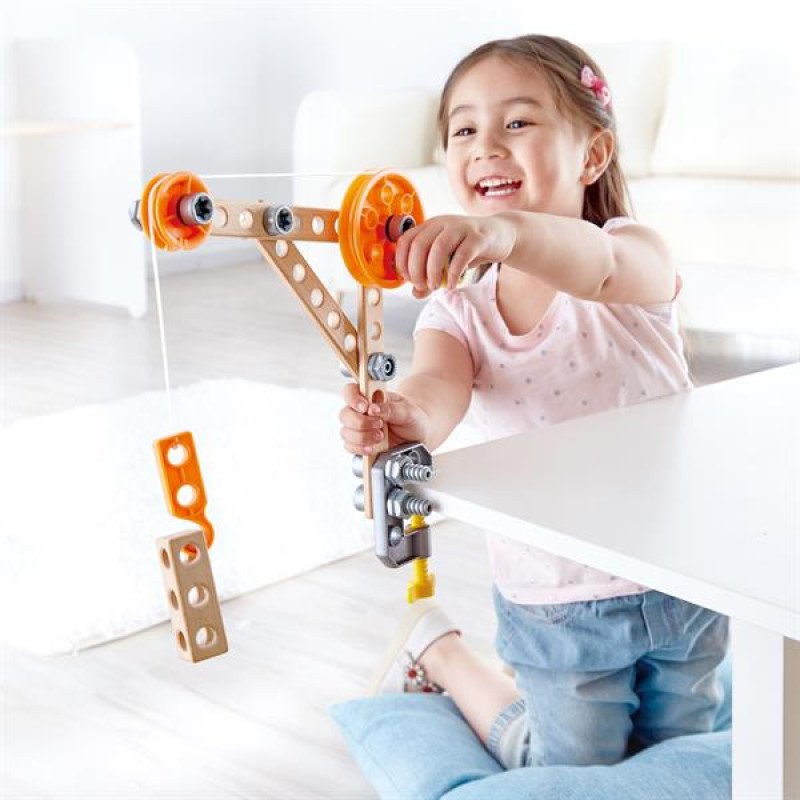 Конструктор Junior Inventor від Hape складається з 37 елементів. За допомогою деталей набору дитина може відтворити 3 захоплюючих експерименти. У міру того, як діти у віці 4 років і старше завершують кожен експеримент, вони створюють незвичайні механізми. Що може вийде: механічний хапач, підйомний кран і 'літаюча' жаба на лебідці. Що є в наборі: Пластикові деталі: 4 довгих болта, 8 коротких болтів, 6 гайок, 4 ковпачкових гайки, великий шків, маленький шків, C-подібний затискач, рукоятка і підвіска Дерев'яні деталі: 2 планки з 7 отворами і дві планки з 9 отворами М'які деталі і аксесуари: силіконовий ремінь, дзвінок, зоотроп, жаба, прокладка і рука. Ігрові набори серії Junior Inventor (юний винахідник) використовуються для розвитку логічного мислення і розуміння принципів науки, технологій, інженерії, мистецтва і математики (STEAM). У всіх деталей заокруглені краї. Конструктор Hape Junior Inventor 3 експерименту 37 ел. (E3030) відповідає міжнародним стандартам якості EN 71 і ASTM F963. Батарейки не потрібні.