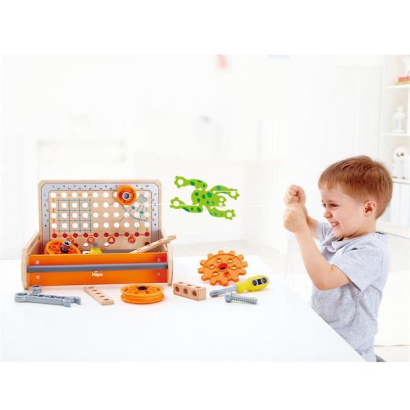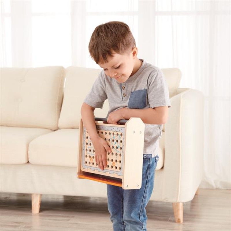 Компактний набір інструментів для маленьких винахідників містить все, що потрібно дітям від 4 років і старше для проведення більш 6 захоплюючих експериментів, які навчать їх науці і винахідництва. У наборі є пластикові, дерев'яні та м'які деталі. Всього 32 предмета і інструкція. Виконуючи завдання з інструкції, ви створите пристрій, який навчить вас науковим принципам, включно з імпульсом, потенційною енергією і збереженням енергії. Що у вас може вийти: дзвонар, звукогенератор з зубчастим колесом, зоотроп, рухома рука, жаба на канатній дорозі і підйомний кран. Що є в наборі: Пластикові деталі: 3 довгих болта, 2 коротких болта, 4 гайки, дві накидні гайки, великий шків, маленький шків, велика шестерня, рукоятка, викрутка і гайковий ключ Дерев'яні деталі: куб з одним отвором, прямокутний блок з трьома отворами, смуга з п'ятьма отворами, смуга з сімома отворами, підвіска і смуга з дев'ятьма отворами М'які деталі і аксесуари: силіконовий ремінь, дзвінок, зоотроп, жаба, прокладка і рука. Ігрові набори серії Junior Inventor (юний винахідник) використовуються для розвитку логічного мислення і розуміння принципів науки, технологій, інженерії, мистецтва і математики (STEAM). У всіх деталей заокруглені краї. Розміри ящика: 30 х 26 х 9 см. Дерев'яний ігровий набір Hape Junior Inventor Ящик з інструментами (E3029) відповідає міжнародним стандартам якості EN 71 і ASTM F963. Батарейки не потрібні.