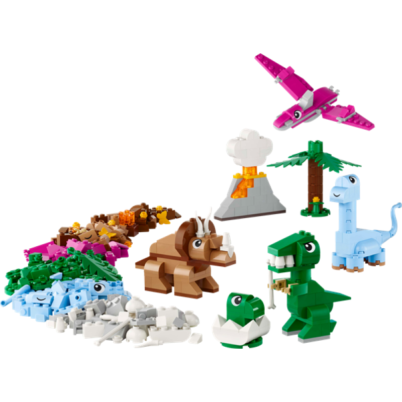 LEGO Classic Творчі динозаври (11041) - дитячий іграшковий конструктор динозаврів із фігурками з кубиків синього, зеленого, фіолетового й коричневого кольорів. Цей універсальний конструктор для дітей є чудовою іграшкою для розвитку творчих навичок конструювання у дітей віком від 5 років, які цікавляться динозаврами.Набір із швидкими в складанні іграшками на тему динозаврів від LEGO містить тиранозавра, птерозавра, трицератопса, бронтозавра й дитинча тиранозавра в яйці, і в комплект також входять вулкан, пальма й аксесуари, які надихнуть дітей на творчу гру. Окрім різнокольорових кубиків, набір також має спеціальні деталі, включно з очима й ротами, щоб додати виразності обличчям динозаврів.Творчі розваги тривають, доки діти поєднують кубики, щоб змінити своїх істот. У міру того, як діти стають впевненішими у своїх конструкторських навичках, вони можуть послуговуватися зрозумілим посібником із конструювання, щоб створювати власні творчі варіанти динозаврів.