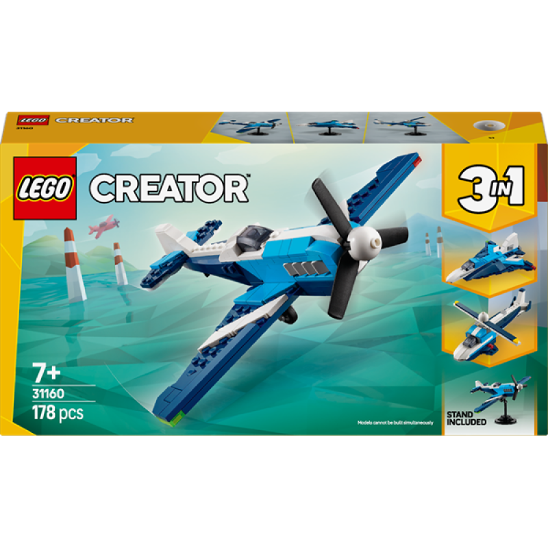 Надшвидкі повітряні пригоди чекають на хлопчиків і дівчаток віком від 7 років завдяки ігровому набору LEGO Creator 3-в-1 Авіація: спортивний літак (31160). Модель літака має пропелер, що обертається, спереду, рухомі колеса, завдяки яким він може пересуватися по землі, і підставку з кубиків для демонстрування.Діти можуть зібрати 3 різних чудових транспортних засоби: іграшковий літак з пропелером, що обертається, і рухомими колесами; реактивний літак з рухомими колесами й модель вертольота з лопатями ротора, що обертаються. Кожну модель можна розмістити на підставці з кубиків, а набір стане чудовим подарунком дітям, які обожнюють розігрувати творчі гостросюжетні історії.Набори LEGO Creator 3-в-1 - чудовий подарунок для дітей із 3 різними моделями, які можна створити й відтворити у різних наборах. Ці набори іграшок-трансформерів 3-в-1 дозволяють малюкам насолоджуватися творчою грою і пропонують приголомшливий асортимент, який відповідає їхнім найбільшим захопленням, як-от надзвичайні транспортні засоби, дивовижні тварини й деталізовані будинки. Зверніть увагу, що моделі не можна створити одночасно.
