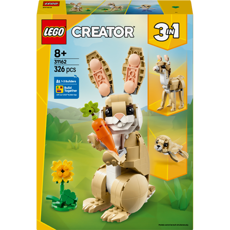 Дозвольте дітям віком від 8 років, які обожнюють тварин, насолоджуватися веселими пригодами завдяки конструктору LEGO Creator 3-в-1 Чарівне кроленя (31162). Ігровий набір тварин для дітей містить іграшкове кроленя з рухомою головою, вухами, передніми й задніми лапами, яке може стояти на 2 або 4 лапках, а також має соняшник і морквину.Дівчатка й хлопчики можуть зібрати 3 різні ігрові набори тварин LEGO з однакових кубиків: рухому фігурку чарівного кроленя із соняшником і морквою, рухому іграшкову ламу з діляночкою зеленої трави й половиною моркви, а також фігурку тюленя зі шматком криги й рибкою. Усі 3 моделі стануть дітям чудовим подарунком для творчої гри й демонстрування.Набори LEGO Creator 3-в-1 надихають дитячу фантазію завдяки 3 різним варіантам моделі в кожному наборі. Діти із задоволенням складатимуть, перетворюватимуть і знову складатимуть. Будуйте разом із друзями та родиною - додаток LEGO Builder пропонує веселий ігровий досвід під час складання цього набору. Зверніть увагу, що моделі не можна створити одночасно.