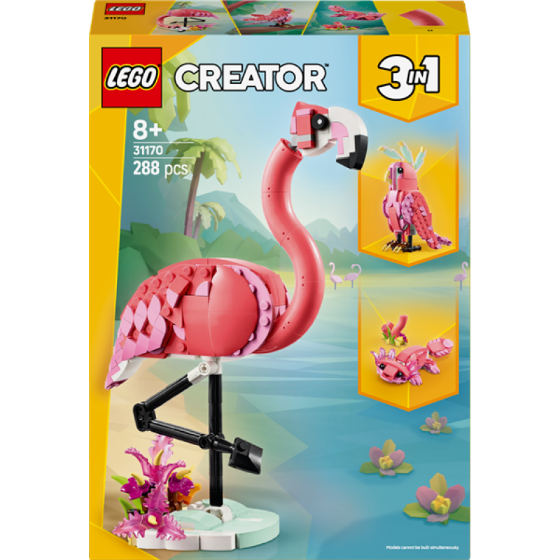 Потіште дівчаток і хлопчиків віком від 8 років, які обожнюють тварин, цим фантастичним іграшковим набором LEGO Creator 3-в-1 Дикі тварини: рожевий фламінго (31170). Рожевий іграшковий фламінго має рухому голову й розташований на невеликій підставці, вкритій рослинами, щоб діти могли насолоджуватися годинами творчих ігор або демонструвати цю фігурку як деталь інтерʼєру кімнати.Цей набір LEGO дарує дітям 3 різні моделі конструктора з використанням однакових кубиків: рожевого іграшкового фламінго з рухомою головою на підставці, покритій рослинами, іграшкового рухомого рожевого какаду, який може повертати голову на 360 градусів, або чарівного рухомого іграшкового рожевого аксолотля з підводними рослинами. Усі 3 симпатичні іграшкові тварини-трансформери LEGO стануть цікавими подарунками для дітей.Набори із серії LEGO Creator 3-в-1 надихають дітей із трьома різними моделями для конструювання в кожному наборі! Діти із захопленням створюватимуть, перетворюватимуть і знову створюватимуть. Набори 3-в-1 пропонують широкий вибір моделей, що відповідають найбільшим дитячим захопленням, як-от надшвидкісні транспортні засоби, дивовижні тварини й деталізовані будинки. Моделі не можна створити одночасно.