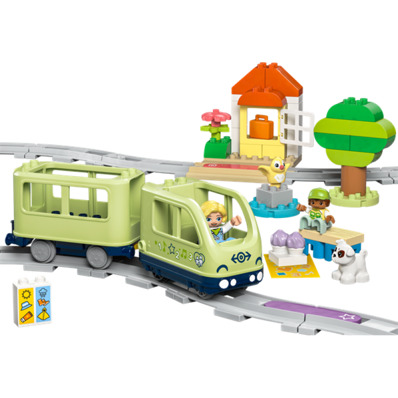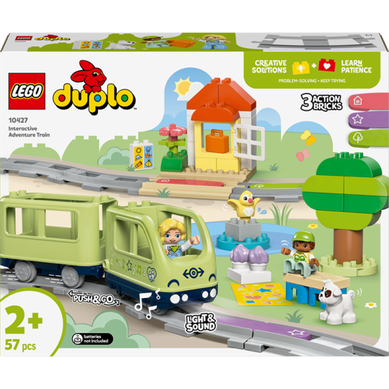 Малюки можуть сісти за кермо інтерактивного пригодницького потяга (10427) для дошкільнят. Цей іграшковий потяг для дітей віком від 2 років дозволяє дошкільнятам обрати пункт призначення для сімейної подорожі, а потім вирушити у пригоди, сповнені вогнів, звуків та навчання.Ця іграшка з набором кубиків, з яких можна побудувати парк, пляж, залізничну станцію або сімейний будинок, розвиває у малюків допитливість і творчість у конструюванні. Зосереджуючись на будівництві залізничної колії та виборі маршруту для пасажирського потяга, малюки, завдяки цій навчальній іграшці, розвивають також терпіння, дрібну моторику і творчі здібності.Ці три кубики оживляють гру, спонукаючи іграшковий потяг видавати реалістичні звуки, коли він проїжджає повз кубики, розвиваючи у дітей навички передбачення, коли вони роблять припущення, який звук видасть потяг. Малюки також можуть використовувати спеціальний кубик для відтворення власних звуків, записаних за допомогою безкоштовного додатку LEGO DUPLO «Інтерактивні потяги» який також дозволяє керувати поїздом завдяки портативному електронному пристрою.
