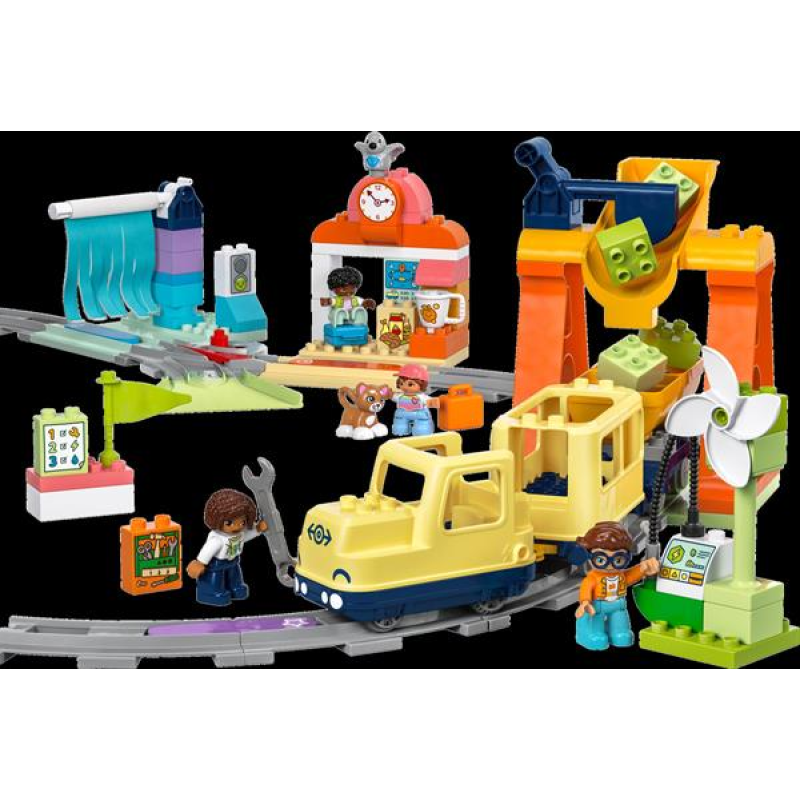 Дошкільнята віком від 3 років вирушають у подорож уяви завдяки великому інтерактивному громадському потягу (10428), призначеному для дітей молодшого віку. Цей інтерактивний ігровий набір з чотирма різноманітними фігурками й безліччю функцій гарантує години захопливого навчання.Навчальна подорож малюків починається на залізничній станції цього набору. Дошкільнята використовують творче мислення, щоб прокласти маршрут для іграшкового пасажирського потяга із системою «штовхни, щоб запустити», вирішуючи серед ходу веселі завдання. Вони можуть навантажити потяг, заправити двигун або помити вагони. Кожна дія оживає за допомогою світла й звуків, коли іграшковий потяг проїжджає повз один із п'яти кубиків. Цей набір також допомагає розвивати терпіння та допитливість, доки малюки експериментують з новими способами побудови залізничної колії.Безкоштовний додаток серії LEGO DUPLO «Інтерактивні потяги» дозволяє малюкам записувати власні звуки для подорожі потяга й керувати локомотивом завдяки портативному електронному пристрою, а також дарує родинам натхнення для створення альтернативних моделей.