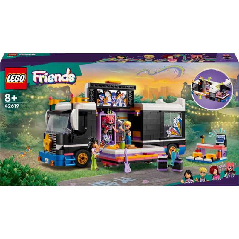 Оживіть сюжетну гру завдяки цьому ігровому набору LEGO® Friends Автобус для музичного туру попзірки (42619) для дівчаток, хлопчиків і дітей віком від 8 років. До набору входить автобус, який можна скласти, а також закулісна зона з аксесуарами й чотири персонажі LEGO Friends.Діти розповідають історію про те, як соромʼязлива Пейслі перетворюється на суперзірку Лей-Лу, використовуючи дзеркало, щоб розкрити свій сценічний образ. Вони можуть уявити безліч історій про дружбу, коли Оллі допомагає створювати вбрання співачки, а Ліан приходить на зустріч зі своєю улюбленою зіркою Лей-Лою.Автобус відкривається спереду, збоку й ззаду, щоб надати доступ до деталей інтерʼєру, як-от закулісна зона, де є місце для запису, клавіатура, гітара, ліжко й ванна кімната. До цього дитячого набору входять аксесуари, зокрема фото з автографом, наплічники, взуття, косметика й мобільний телефон.Ця іграшка стане чудовим подарунком для музичних дітей або меломанів, які полюбляють сюжетні ігри. Це також чудова іграшка, яка допоможе дітям у роботі над власним соціальним й емоційним розвитком.