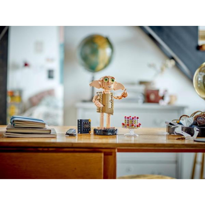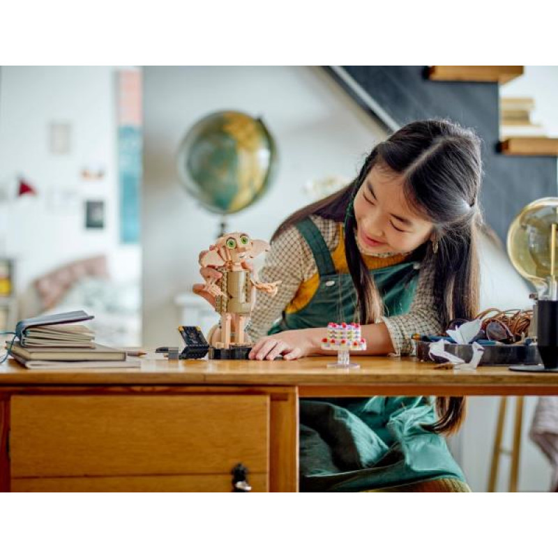 Порадуйте шанувальника Гаррі Поттера першою в історії LEGO® моделлю Добі, домашнього ельфа з кубиків. Миттєво впізнавана фігурка має голову, яку можна змінювати, а також руки й пальці, щоб Добі міг тримати культові деталі, що входять до набору. Серед аксесуарів - детальна модель шкарпетки Гаррі Поттера, яку Гаррі використав, щоб звільнити Добі, у щоденнику Тома Редла, а також пудинг тітки Петунії, який «літає», щоб надихнути на спогади про класичні сюжети.