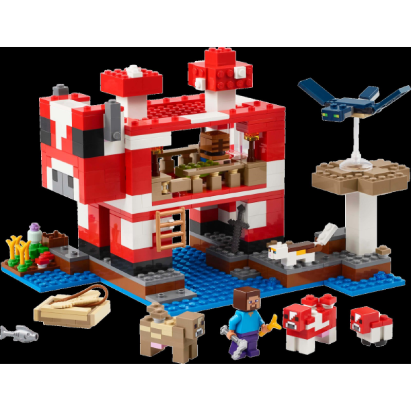 Іграшка LEGO® Minecraft® Грибний будинок (21270) ідеально підходить для гравців Minecraft і дітей, які люблять створювати будинки, доглядати за тваринами й відбивати випадкові повітряні атаки! Цей захопливий ігровий набір - чудовий подарунок для дівчаток і хлопчиків віком від 8 років.Розташований на грибному острові, цей набір LEGO Minecraft для створення будинків включає популярного персонажа Стіва, а також червоного мушрума, його малюка, брунатного мушрума, кішку каліко й ворожий летючий привид. Ігровий набір містить елементи, що фігурують у грі: невелика ферма з пшеницею, грибами та рослинами-пітчерами, що ростуть поряд із компостером. Серед аксесуарів - вудка, тріска, мотика, незеритовий меч, миска, човен з веслами, скриня, піч, верстак, книжкова полиця, хліб і ліжко. Додаток LEGO Builder дарує дітям додаткові розваги з можливістю використовувати свій пристрій, щоб збільшувати та обертати моделі у форматі 3D.