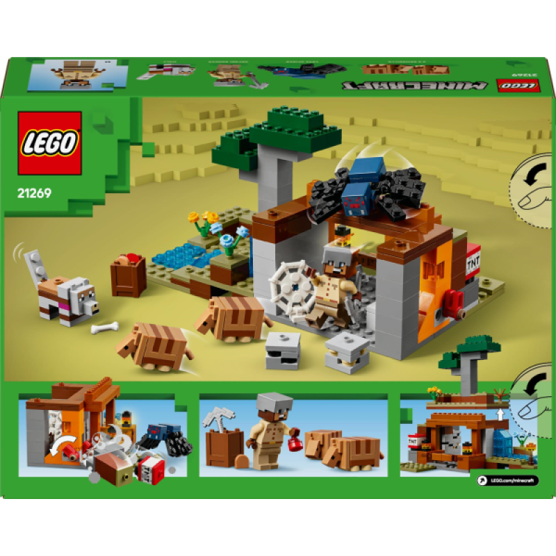 Шахтна експедиція «Броненосець» (21269) дозволяє гравцям Minecraft відтворити елементи популярної відеогри на практиці. Ця іграшка LEGO Minecraft з крутими персонажами та веселими функціями - захопливий набір для геймерів, сповнений творчих ігрових можливостей для дітей віком від 8 років.Модель, розміщена в біомі савани з відеогри, оснащена міною з тротилом, керованим важелем, для підриву ділянок місцевості й видобутку дорогоцінної руди. У наборі є іграшковий печерний павук і вовк, а також 2 броненосці, які дають луску для виготовлення вовчої броні. Збоку від копальні є невелика річка і лавовий водоспад. Набір легко змінюється, щоб надихнути на нові пригоди. Для додаткових цифрових розваг додаток LEGO Builder дозволяє дітям збільшувати та обертати моделі у 3D за допомогою свого пристрою.