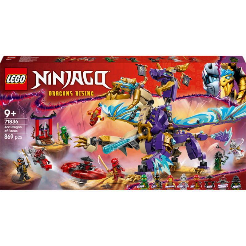 Порадуйте хлопчиків і дівчаток віком від 9 років цим ігровим ніндзя набором LEGO NINJAGO Arc Dragon of Focus (71836), яка дозволяє дітям розігрувати легендарні бойові сцени з 3 сезону телешоу NINJAGO: Повстання драконів. Цей конструктор містить двоголову фігурку дракона з рухливим хвостом, кінцівками, головою, шиєю, щелепою й кігтями. Діти можуть активувати вогонь в його грудині й рухати його великі крилами вперед і назад за допомогою важеля на спині.Цей бойовий ігровий набір містить 8 мініфігурок персонажів серії NINJAGO, з якими шанувальники ніндзя можуть розігрувати насичені пригоди. У наборі ви натрапите на воїнів-ніндзя Ллойда, Коула, Вайлдфаєр і Кая, а також їхнього союзника Піксала, кожен з яких має зброю ніндзя, а також лиходіїв: Дрікса, Заркта й Воїна-дракона з їхньою власною зброєю.Для цікавішої гри до набору LEGO входить крутий спінер Спін-джитсу. Діти можуть помістити мініфігурку всередину й натиснути кнопку пуску, яка запустить персонажів у швидке обертання, а потім можна спостерігати, як 2 силові елементи можуть вилетіти, потрапивши у ціль.