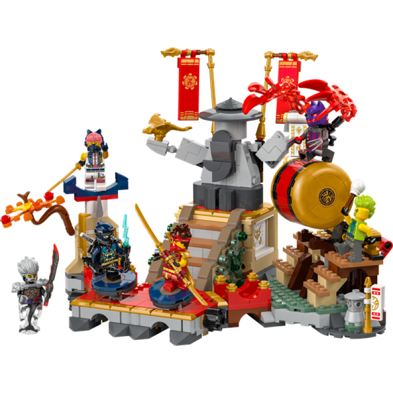 Цей деталізований набір «Бойова арена турніру» (71818) дозволяє хлопчикам і дівчаткам віком від 7 років відтворити драматичне фінальне протистояння з другого сезону серіалу NINJAGO® Повстання драконів. Ігровий набір для битви ніндзя містить безліч інтерактивних функцій, щоб забезпечити дітям години гри. Опісля вона стане привабливою моделлю для демонстрування на полиці або приліжковій тумбочці.Цей набір LEGO® NINJAGO містить дві рухомі платформи, щоб діти могли розігрувати захопливі битви між ніндзя і лиходіями; також у набір входить великий барабан, який діти можуть зіштовхнути з підставки, щоб викотити його на арену, і сходи, які руйнуються від натискання важеля, змушуючи будь-яких персонажів на них падати у прірву.Цей іграшковий конструктор ніндя містить також 6 мініфігурок NINJAGO. Ніндзя Кай і Сора в турнірних обладунках і з досі небаченими короткими катанами зіштовхуються у бою зі збіговиськом лиходіїв: Сіндером, Воїном у вовчій масці та, ексклюзивно створеними для цього набору, Злим Джеєм і Токс.