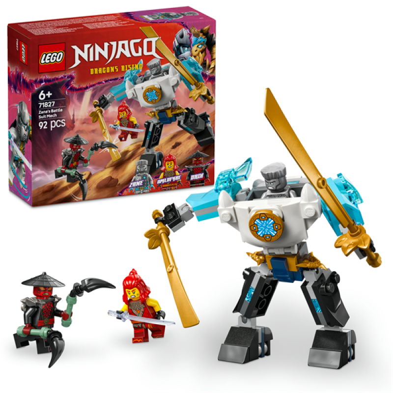 Ігровий набір LEGO NINJAGO Бойовий костюм-робот Зейна (71827) дозволяє хлопчикам і дівчаткам віком від 6 років влаштовувати захопливі пригоди з 3 сезону серіалу Ніндзяго: Повстання драконів. Цей конструктор для дітей містить робота NINJAGO з рухомими руками, ногами й кистями, верхньою частиною тіла, яка обертається на 360 градусів, грудною клітиною, що відкривається, щоб помістити мініфігурку всередину, і два великі мечі.Цей ігровий набір LEGO містить три мініфігурки персонажів NINJAGO: Зейна з 2 сюрікенами, Вайлдфаєр із кришталевим мечем-катаною й Дрікс, майстера Рою із Забороненої пʼятірки, із 2 серпами, тож діти можуть насолоджуватися годинами пригод у сюжетних іграх у обʼєднаному світі NINJAGO.Серед дитячих конструкторів серії LEGO NINJAGO є роботи, дракони й храми, щоб шанувальники могли розігрувати сюжетні пригоди. Кожен ніндзя-набір можна створити завдяки додатку LEGO Builder, який допоможе вам і вашій дитині у легкій та зрозумілій будівельній пригоді.