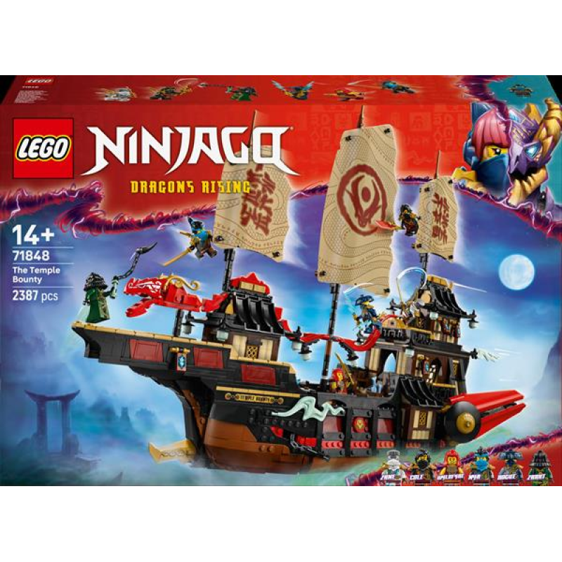 Старші шанувальники NINJAGO віком від 14 років зрадіють можливості додати іграшковий корабель «Щедрість храму» (71848) до власної колекції моделей LEGO NINJAGO. Велика й детальна модель човна є найновішою в лінійці відомих кораблів NINJAGO і наповнена цікавими можливостями й функціями. Вона також має підставку, щоб шанувальники могли продемонструвати її на полиці чи тумбочці.Цей інтерактивний пригодницький ігровий набір містить усе необхідне шанувальникам ніндзя, щоб відтворити історії з 3 сезону серіалу NINJAGO: Повстання драконів: механізм, щоб розправляти й згортати вітрила, знімні дах і підлогу, щоб отримати доступ до внутрішніх приміщень корабля, де розташовані суші-бар і стіл у головній каюті, який можна скласти, щоб побачити таємний компʼютер.У набір також входять 6 мініфігурок: Зейн, Коул, Вайлдфаєр, Нія, Розбійник і лиходій Заркт, всі озброєні крутими аксесуарами у вигляді зброї. Ніндзя мають напівпрозорий зʼясувальний клинок, який допомагає відшукати таємну карту на столі капітана. Набір містить 2387 деталей.