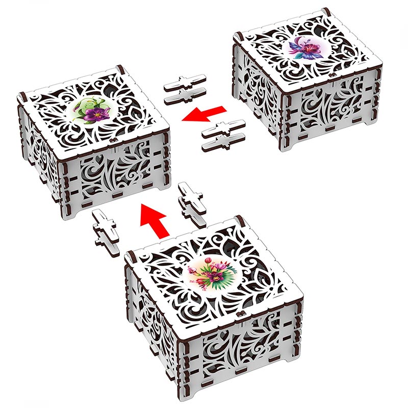 Дерев'яний конструктор, що поєднує в собі майстерність ручної роботи й ігрову магію. Скринька вражає витонченим квітковим дизайном і прихованим механізмом, який оживляє предмет при взаємодії, створюючи відчуття дива.