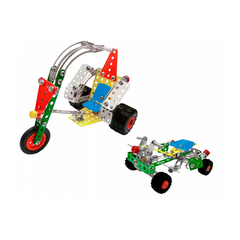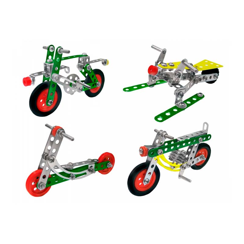 Набор состоит из 198 деталей, включая металлические элементы разных цветов и яркие пластиковые вставки, которые придают готовым моделям особую выразительность. Благодаря комплекту цветных пошаговых инструкций можно собрать до 8 уникальных моделей мототехники.