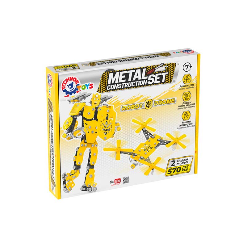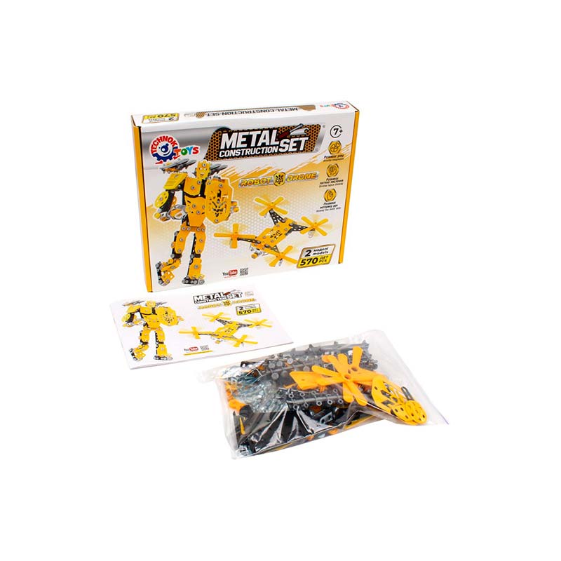 Іграшка "Конструктор металевий ТехноК" — це ідеальний вибір для юних інженерів та винахідників, які захоплюються світом сучасних технологій та робототехніки. Набір складається з 570 деталей, які дозволяють зібрати одразу дві вражаючі моделі: потужного робота з щитом та сучасного дрона.