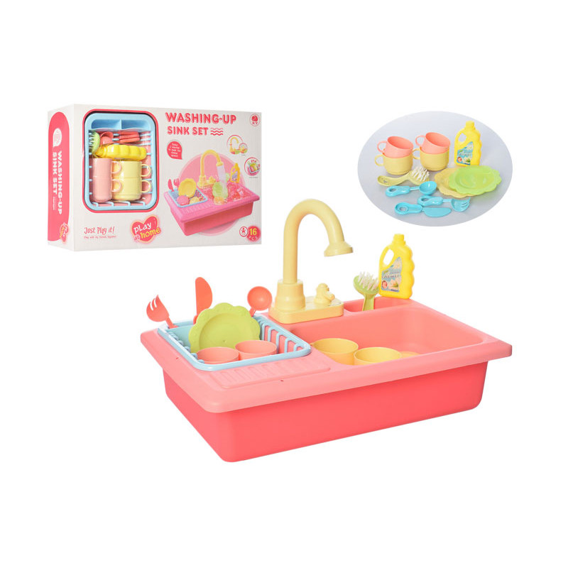 Кухонна мийка з набором посуду, озвучена, зі світлом - ігровий набір являє собою конструкцію у вигляді мийки, збоку є підставочка для посуду. У спеціальне відділення всередині мийки можна заливати воду, і вона буде бігти з крана. У наборі є: 2 тарілочки, 4 чашечки, ложечка, виделочка, пляшечка, щітка для миття. Виконана з міцного пластику. Розмір конструкції: 40*27*25 см.