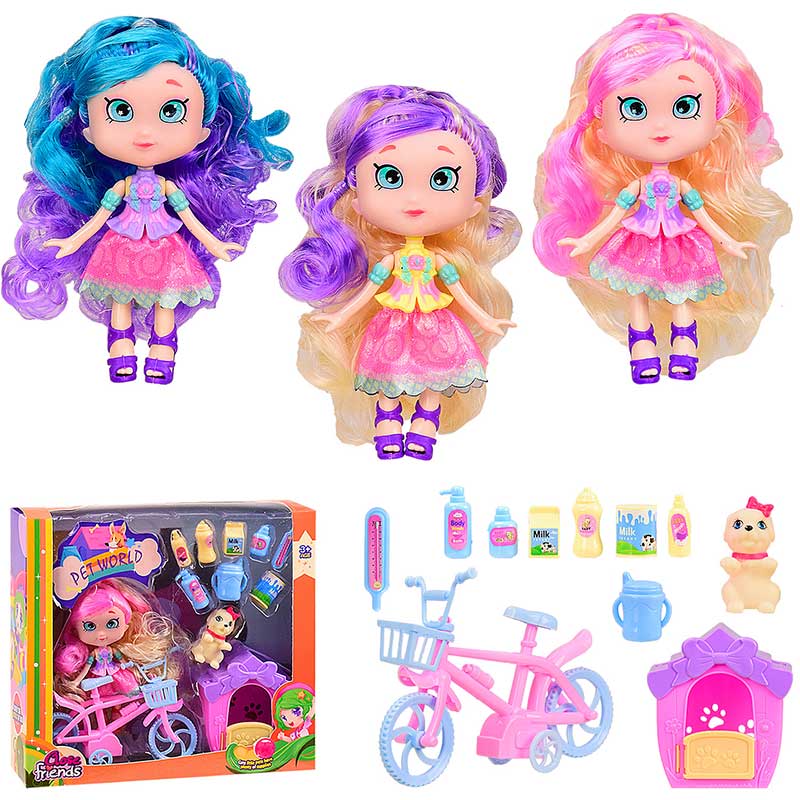 Лялька дитяча + велосипед вихованець будка 3 види в коробці 23,5х6х21,5 см