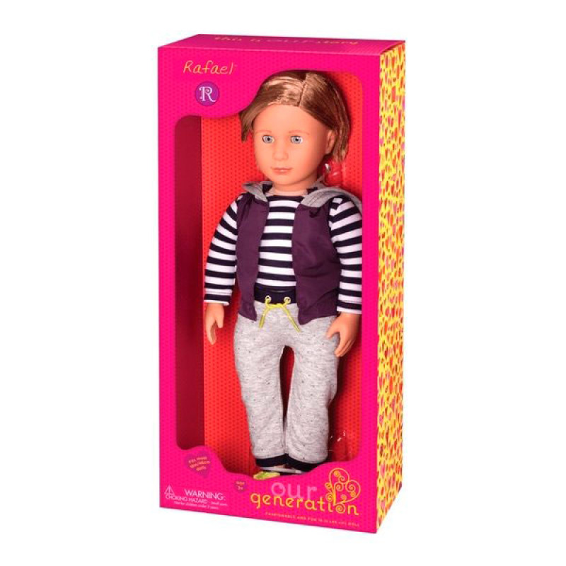 Лялька Our Generation хлопчик Рафаель являє собою стильного молодого хлопця з густим світлим волоссям, який одягнений у зручний шкільний костюм. З нею діти можуть втілювати свої власні сюжети і пригоди, розвиваючи водночас свою фантазію і навички рольової гри.