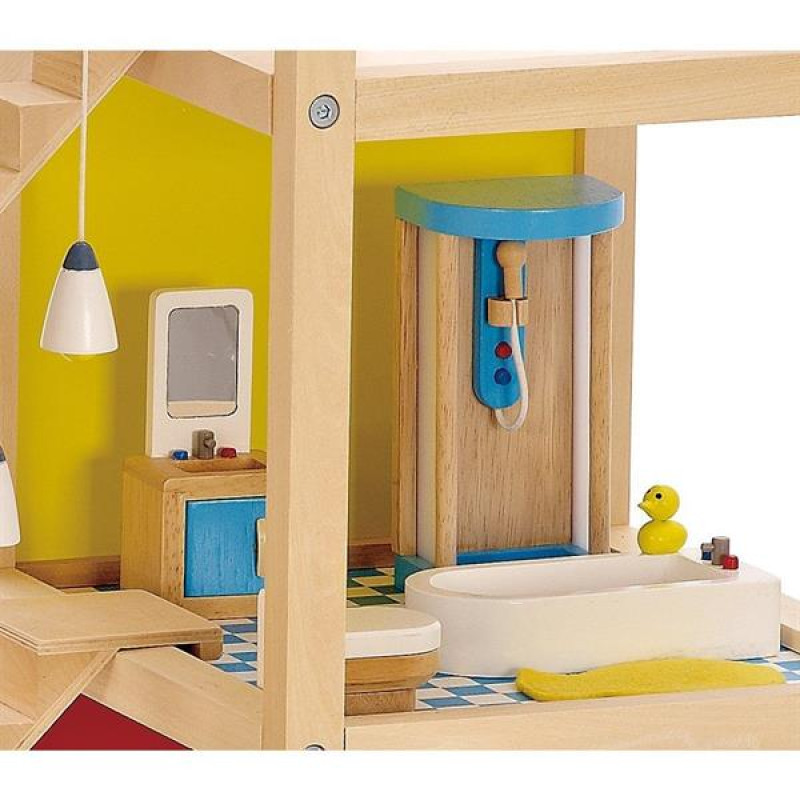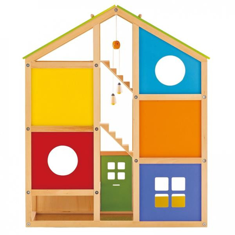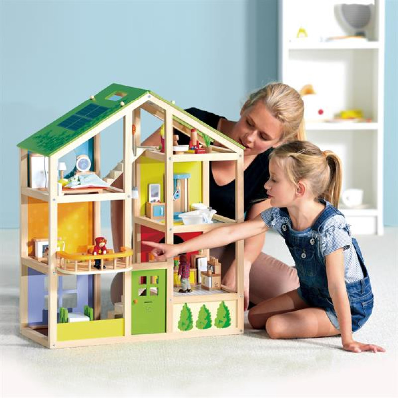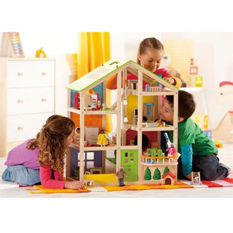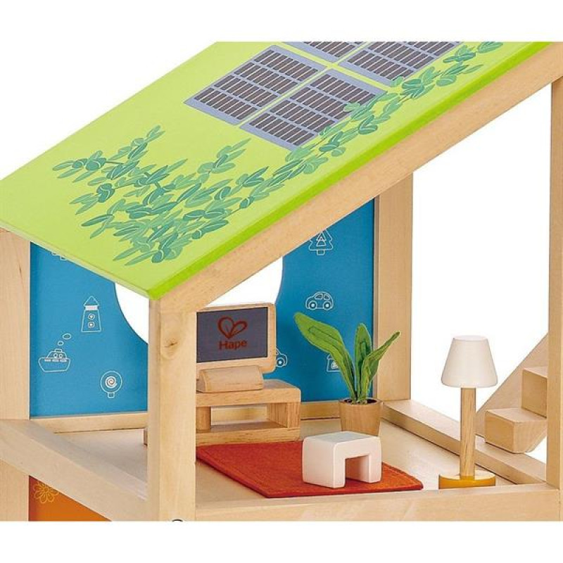 Ляльковий будиночок Hape із дерева з меблями створений для дітей віком від 3 років. Це красиво оформлений ляльковий будиночок, який, напевно, надихне дитину на рольові ігри та вигадування різних домашніх ситуацій у ляльковій родині.На даху є сонячна панель. У будинку шість кімнат із меблями для ляльок. Лялькова сім'я може читати книги на затишній мансарді, відпочивати в головній спальні, чепуритися в сімейній ванній, розважатися в домашньому кінотеатрі, готувати на кухні та проводити час у вітальні з каміном.Ляльковий будиночок може надихнути дитину на творчість, оскільки в ній є рухомі частини, що дозволяють облаштовувати та прикрашати будинок за смаком.Будинок міцний завдяки конструкції із цільного дерева. Деталі вкриті яскравою фарбою, безпечною для дітей.Ляльковий будиночок Hape з меблями пробуджує уяву та творчі здібності, заохочує дітей до сюжетно-рольової гри. Гра з будиночком також навчає цінним соціальним навичкам, таким як спілкування, співпраця, довіра, дружба.Іграшка відзначена нагородами на 4 виставках, серед них Oppenheim Toy Portfolio Platinum Seal Award 2011 та Вибір батьків 2011, США.