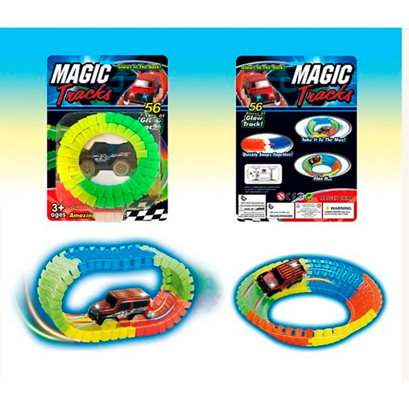 Magic Tracks з підсвічуванням 56 елементів - це дорога, що світиться, яка потішить будь-якого хлопчиська від 3 років яскравими кольорами та різноманітністю барвистих деталей, за допомогою яких можна зібрати гнучку дорогу.