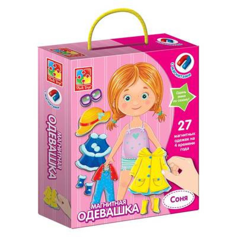 Дитяча магнітна одягалка"Соня" (укр) VT3702 - 07 - набір, виконаний з міцного, екологічно чистого картону. Пазли - універсальний подарунок для дитини старше за три роки, який ідеально доповнить щоденні ігри Вашого малюка. Виробник потурбувався про абсолютну безпеку ігрового набору для дитячого здоров'я, тому для створення використав виключно екологічно чисту, нетоксичну сировину і барвники, що не мають неприємних запахів. Яскраві дитячі пазли на магніті включають 27 елементів одягу, лялечки і інструкцію для початківців. Ігровий набір спрямований на розвиток дрібної моторики, асоціативного мислення, розширення кругозору, формування самостійності і цілеспрямованості. Пазл порадує Вашу крихітку неймовірно яскравим оформленням в приємному забарвленні, яке не дратує дитячі очки і позитивно впливає на сприйняття кольорів.