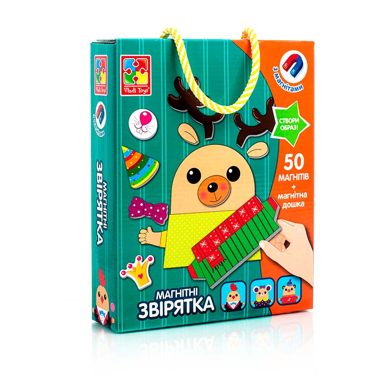 Магнітна гра Звірята укр. - ви коли-небудь зустрічали сову-чарівницю або свиню-детектива? Познайомтеся з цими та багатьма іншими звірятами в нашій грі! У наборі ви знайдете 8 різних звіряток. Кожна має свої магнітні атрибути. Підбирайте їх правильно та кріпіть до спеціальної магнітної дошки. Наприклад, додаємо оленю роги та затишний зелений светр. Експериментуйте та міняйте магніти місцями! Нехай у зайчика з'явиться п'ятачок, а в котика - дзьоб. Як можна було б назвати цих химерних тварин? Придумуйте історії їхніх неймовірних перевтілень. Комплектація: магнітна дошка, 47 магнітів, інструкція. Гра розвиває естетичний смак і фантазію, а також тренує пам'ять і дрібну моторику.